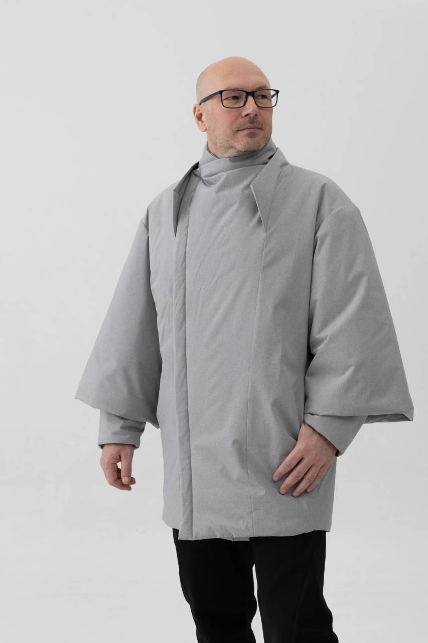 Укороченное лаконичное пальто свободного силуэта по мотивам кимоно, заужено книзу,
