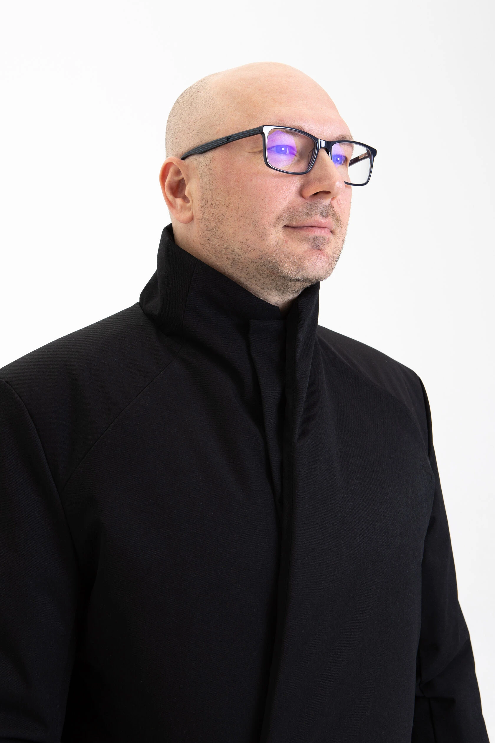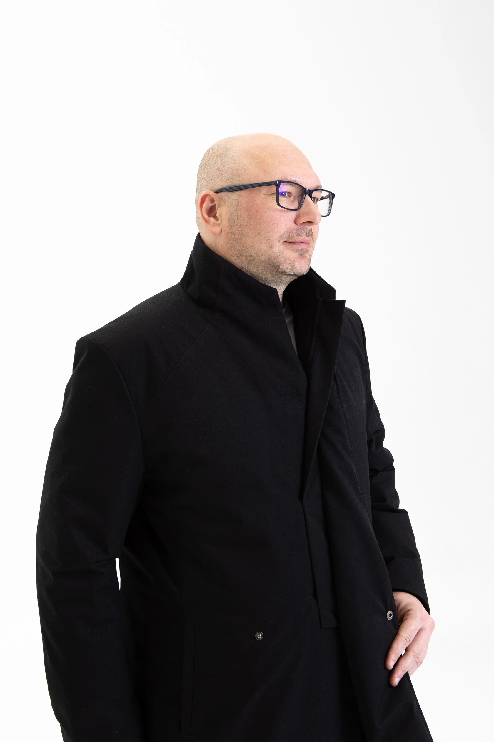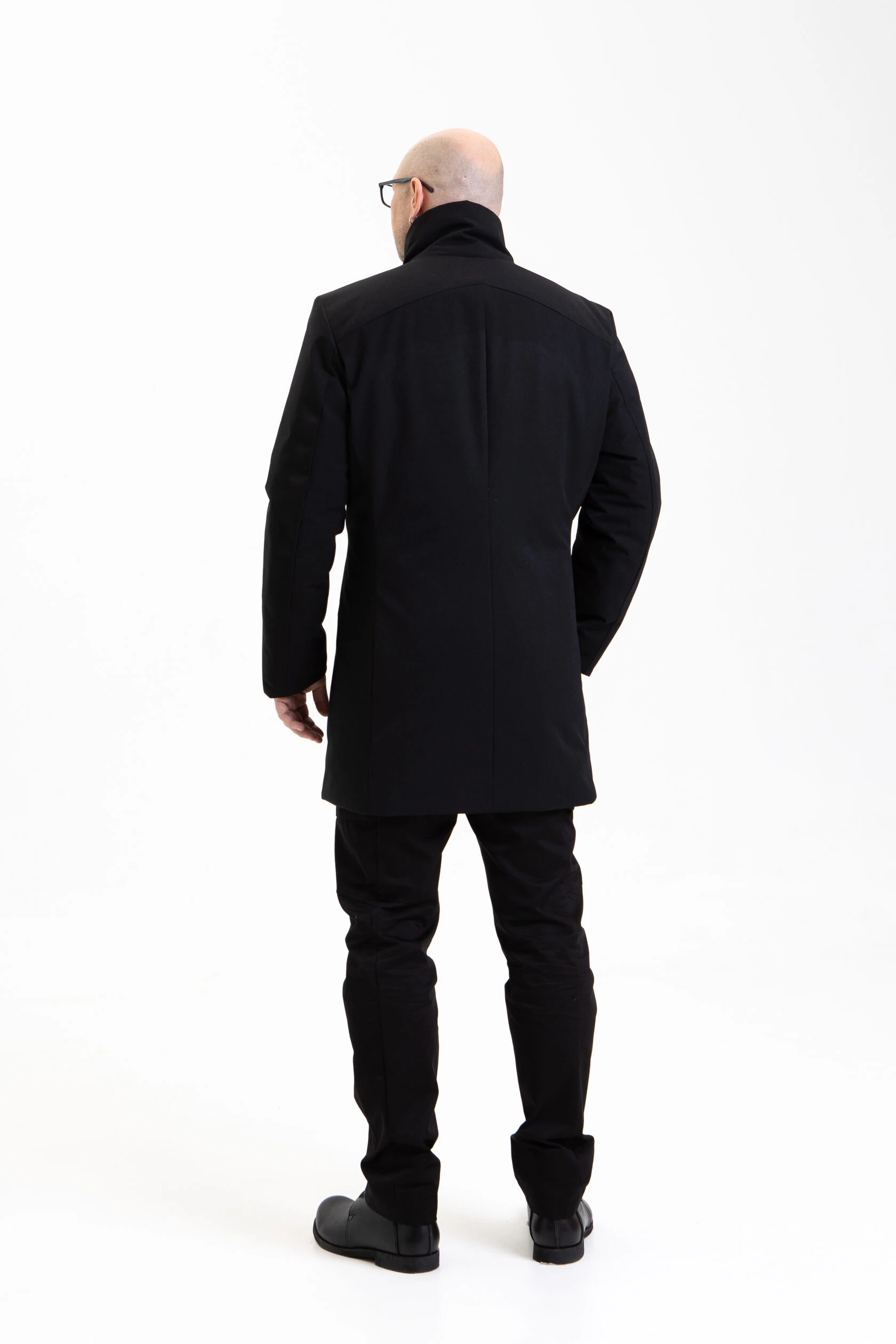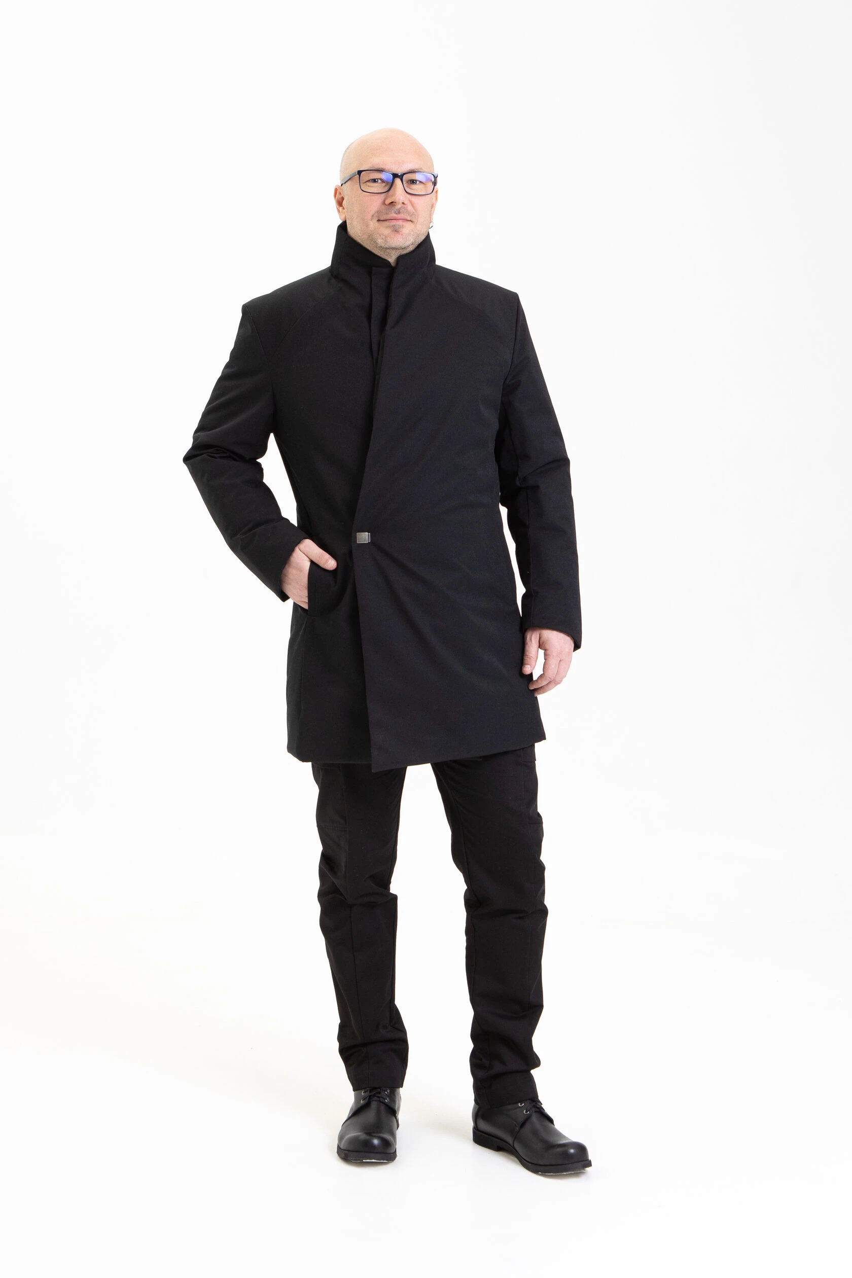 Воротник-стойка аккуратный и близкий к шее. Объёмный шарф лучше намотать поверх воротника. Спереди воротник ниже, чем сзади, чтобы он не упирался в кадык и не спорил с бородой.