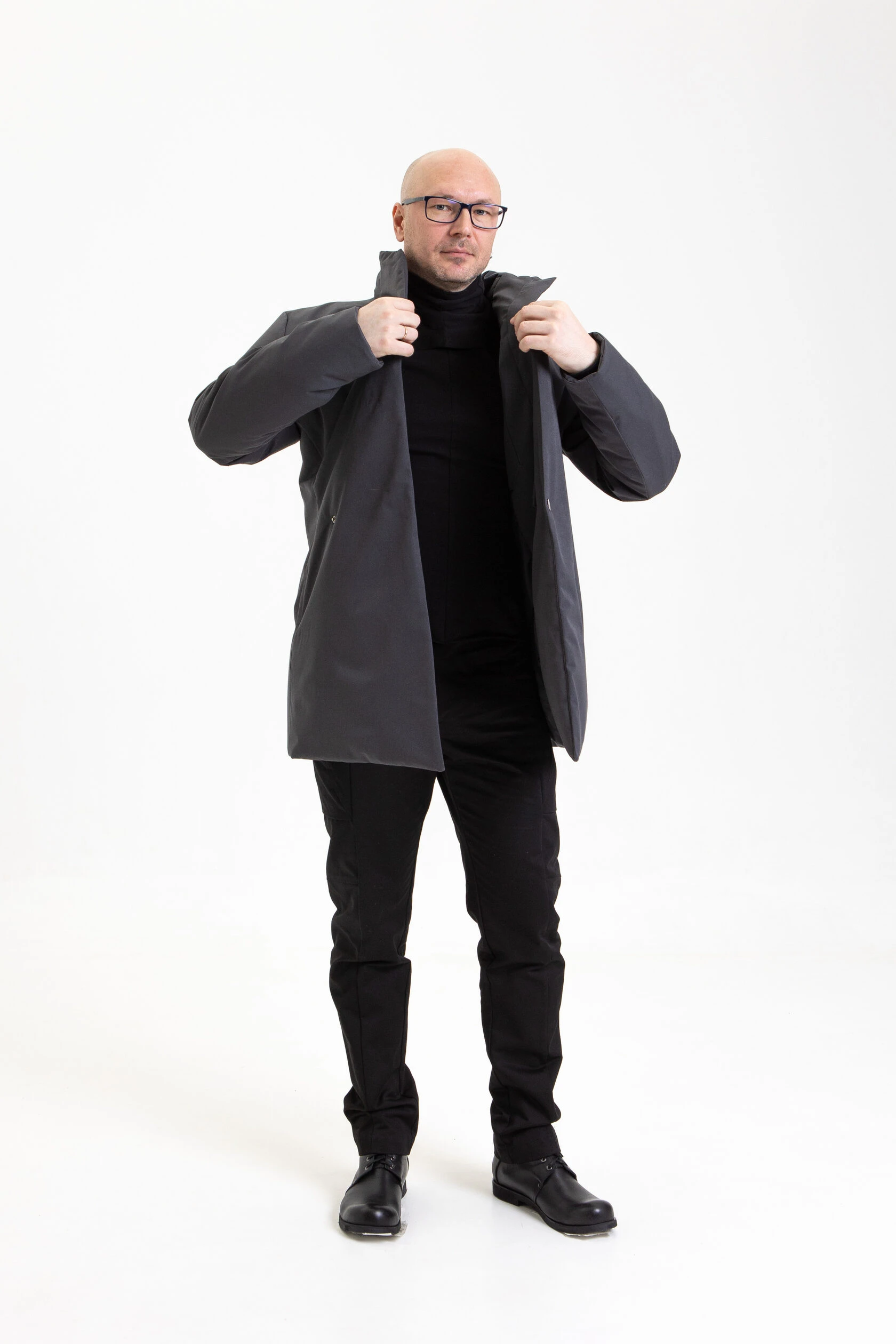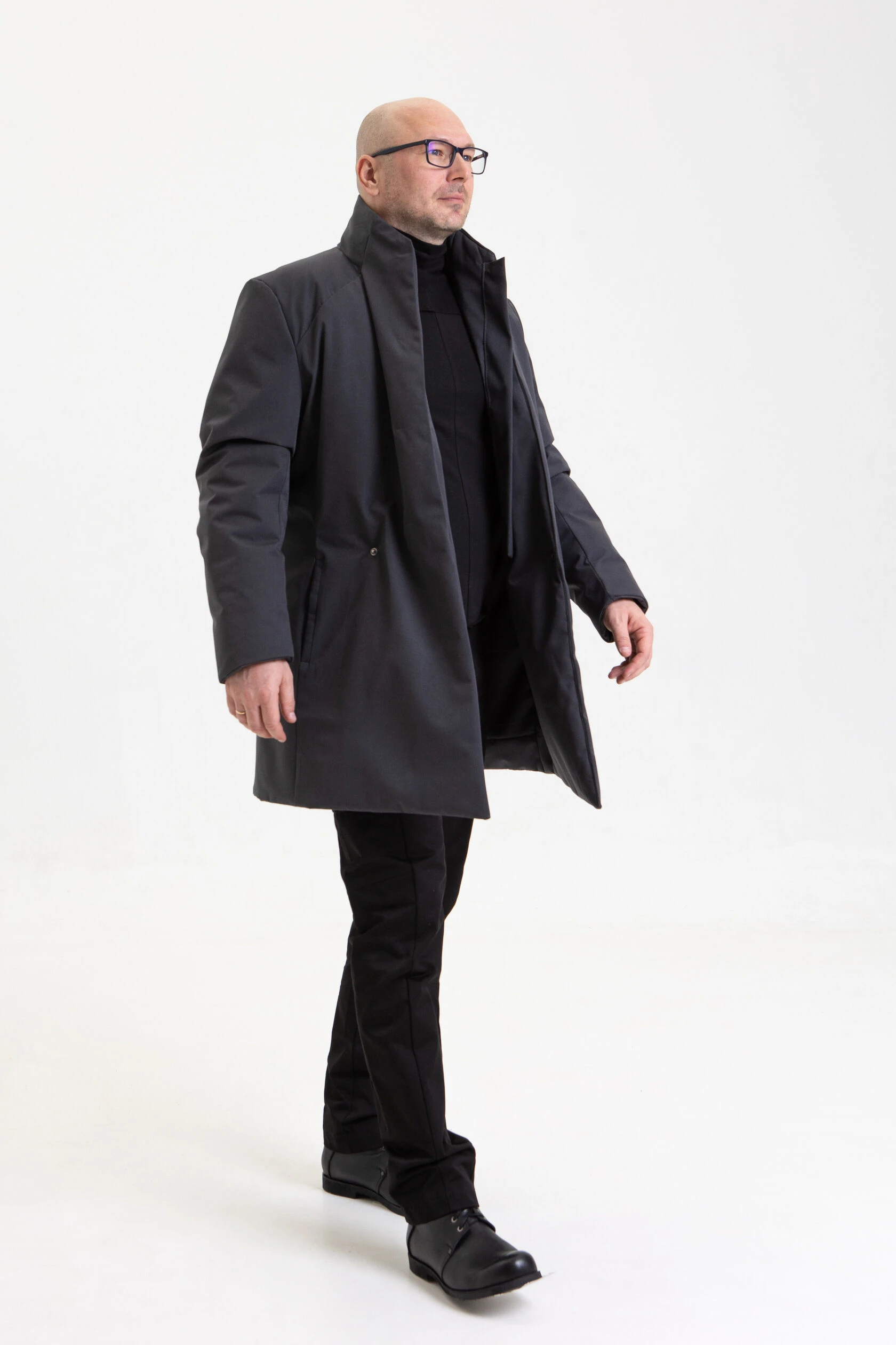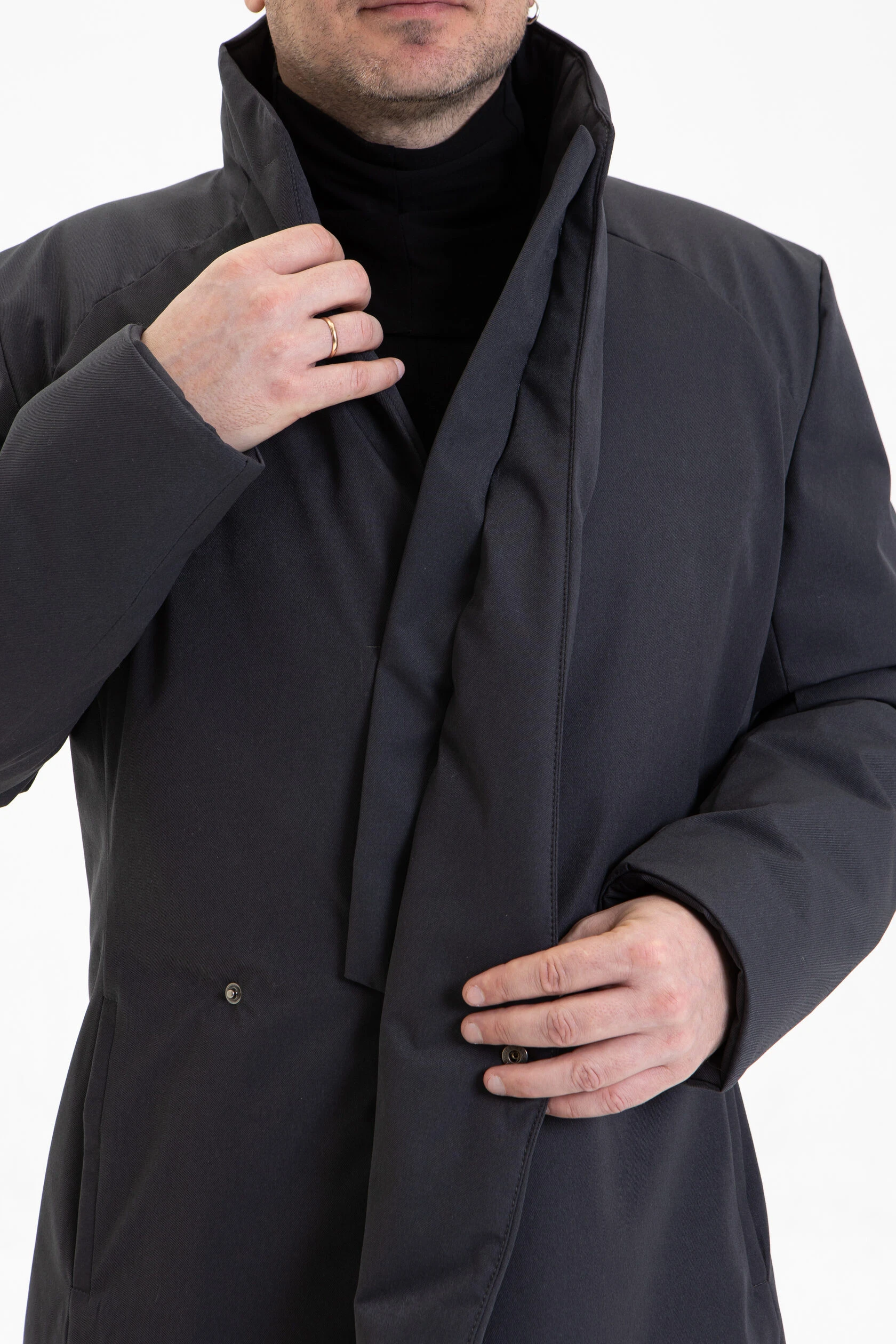 Воротник-стойка аккуратный и близкий к шее. Объёмный шарф лучше намотать поверх воротника. Спереди воротник ниже, чем сзади, чтобы он не упирался в кадык и не спорил с бородой.