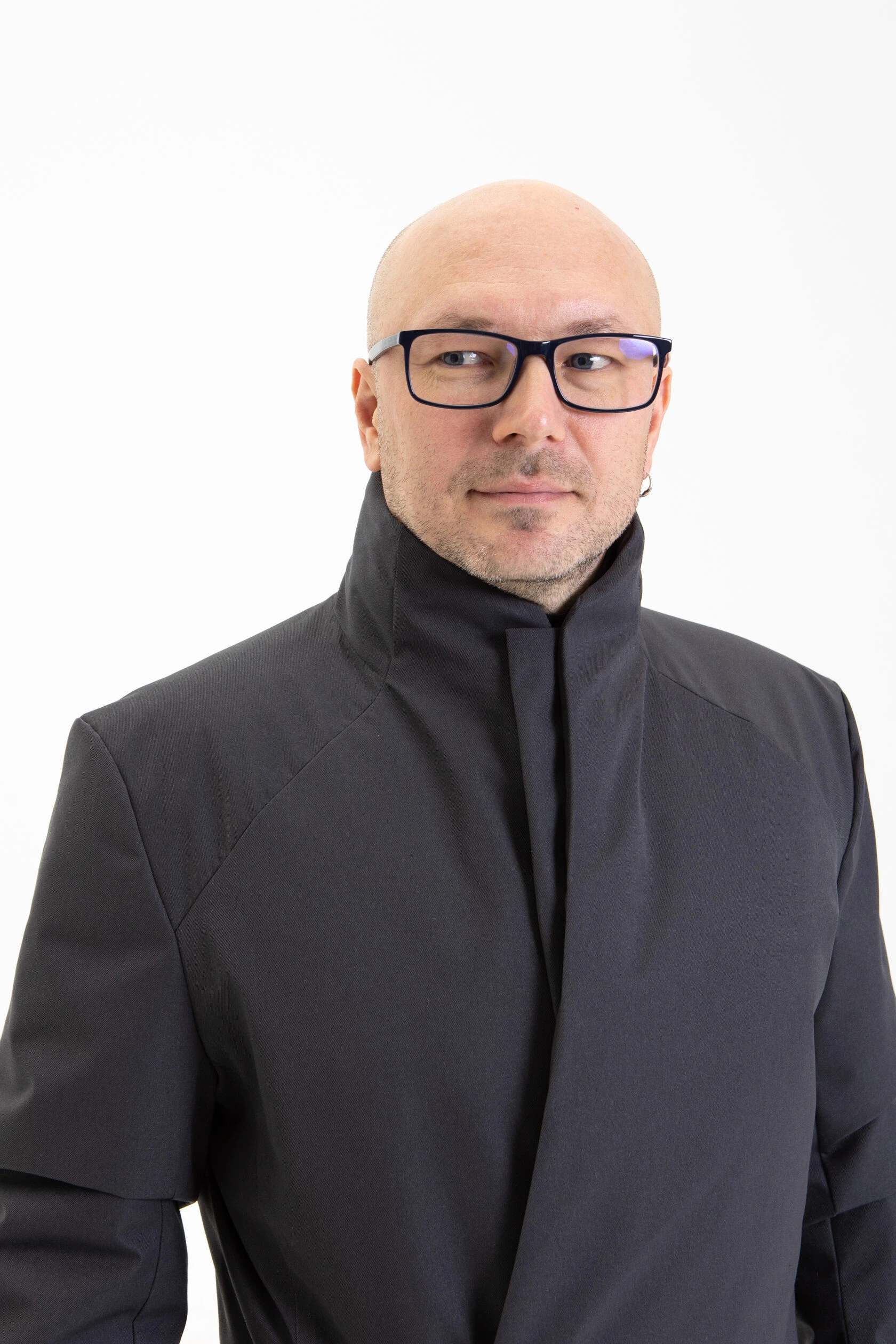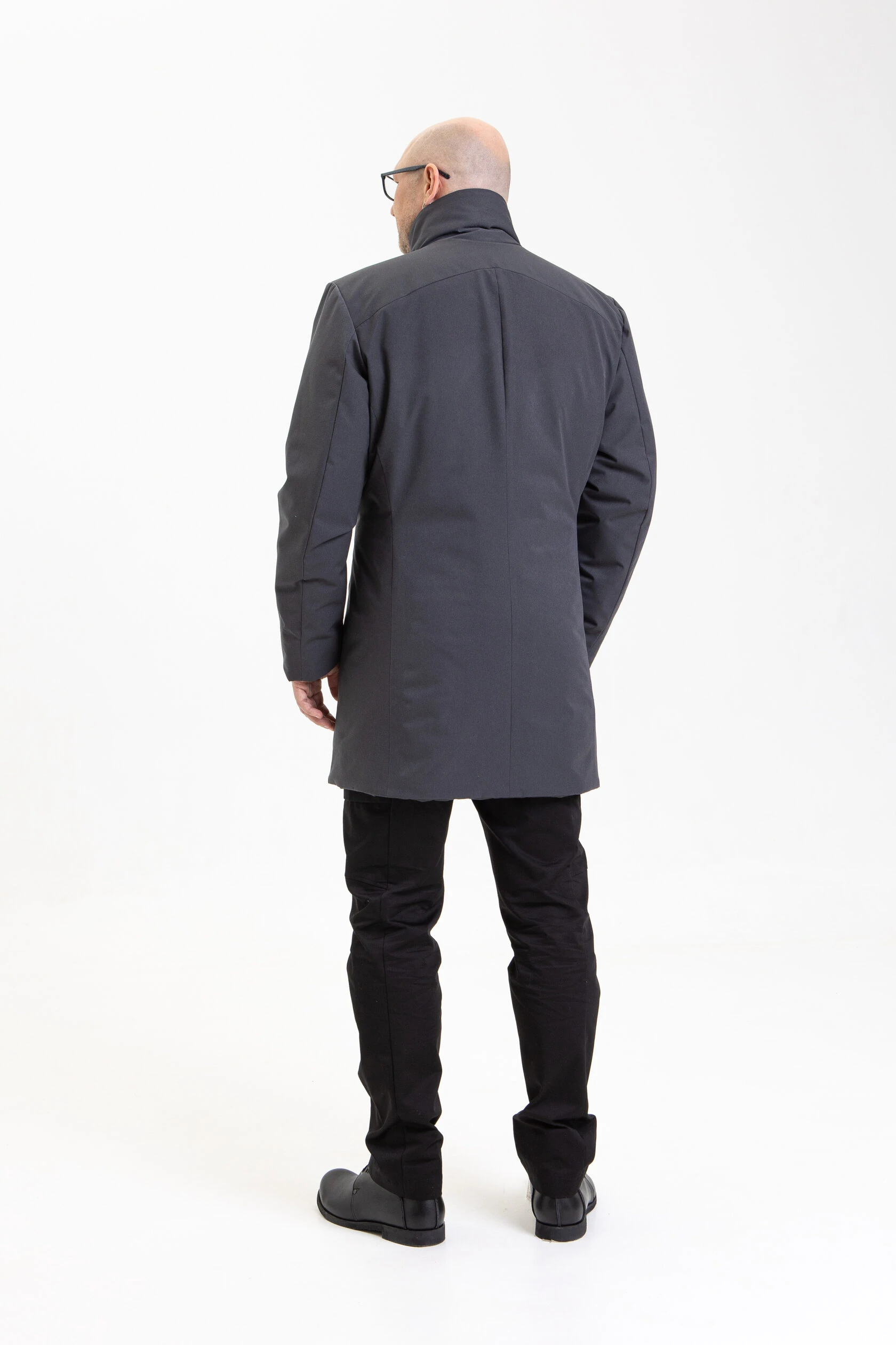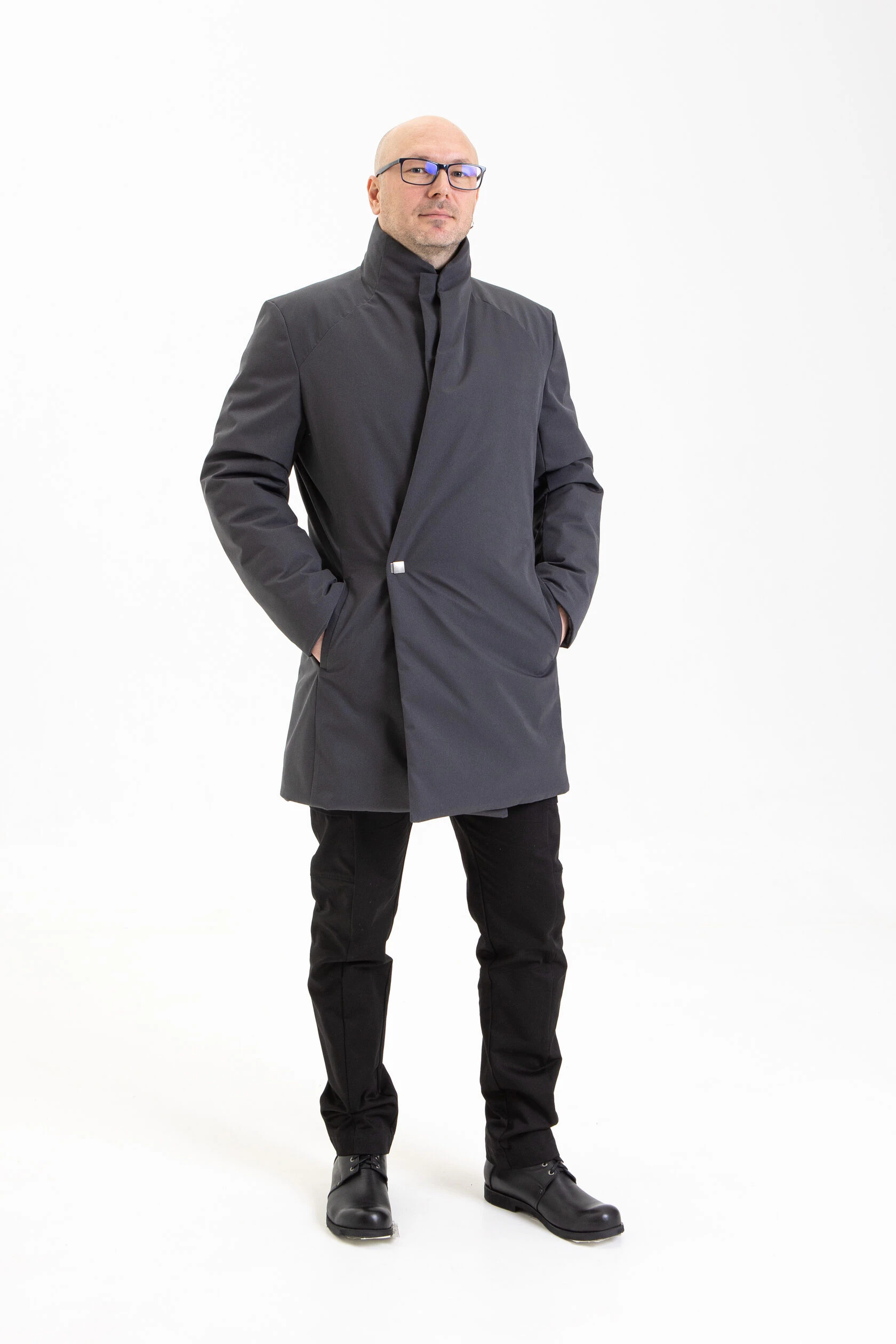 Воротник-стойка аккуратный и близкий к шее. Объёмный шарф лучше намотать поверх воротника. Спереди воротник ниже, чем сзади, чтобы он не упирался в кадык и не спорил с бородой.