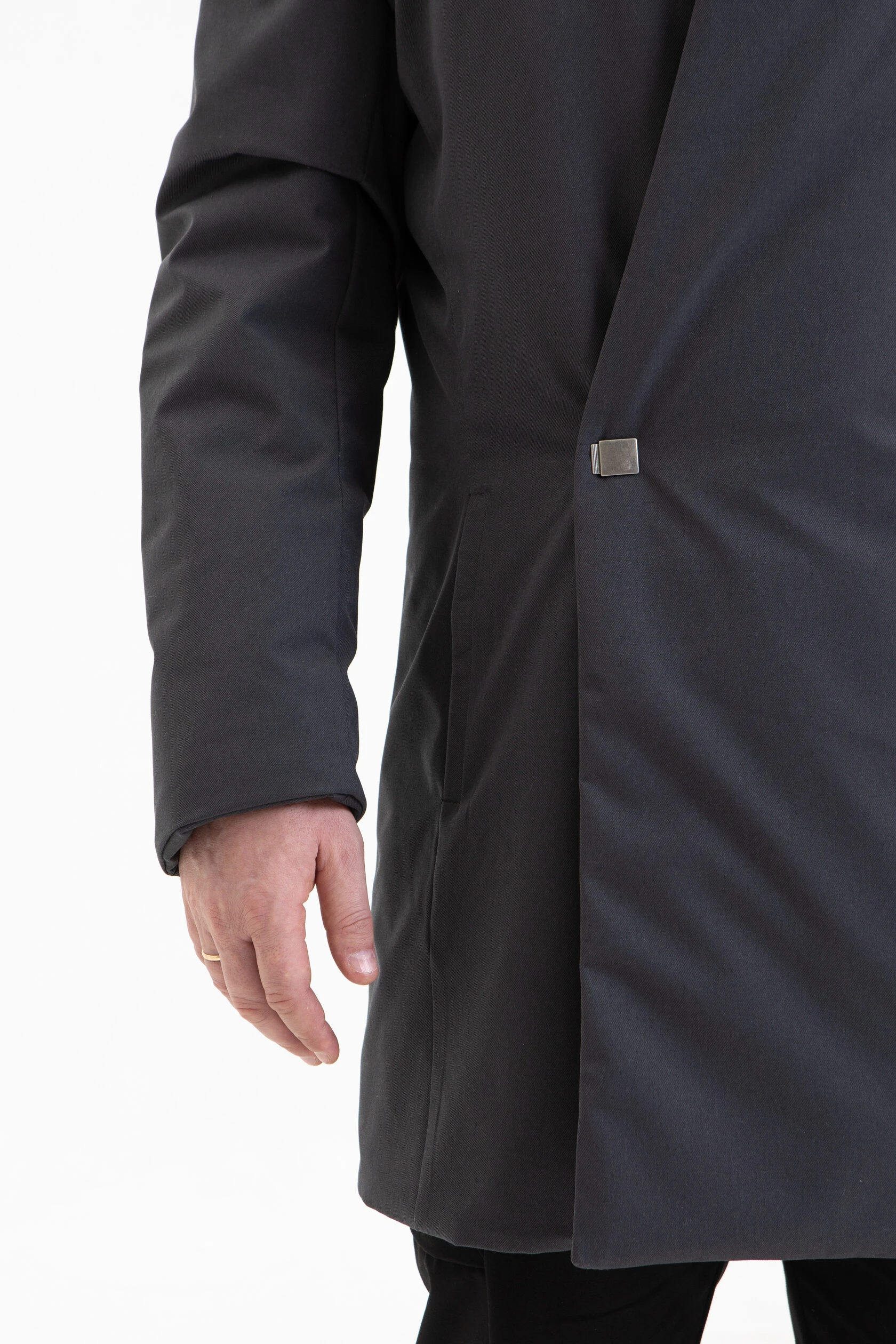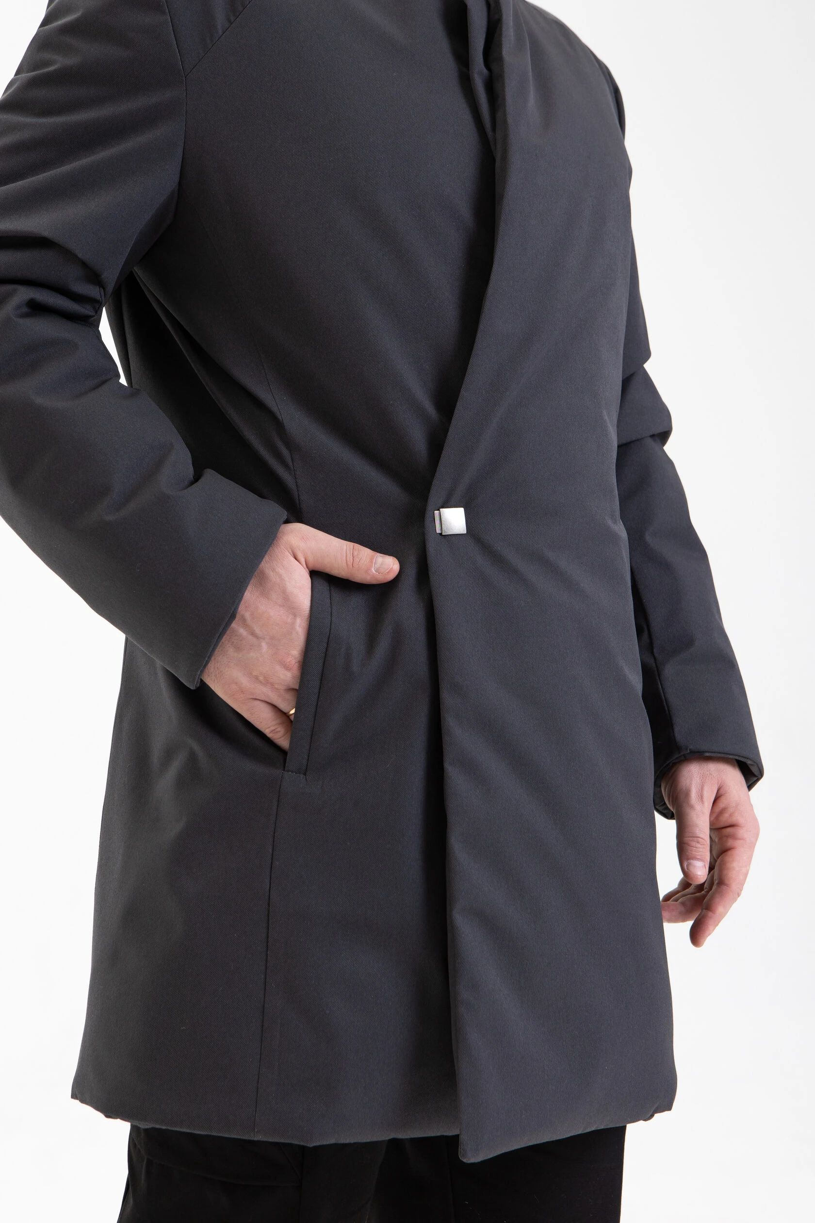 Пальто застёгивается на магниты. Магнитная планка слегка выглядывает из-под воротника, а затем прячется под полы пальто. На талии предусмотрена дополнительная застёжка на кнопку.