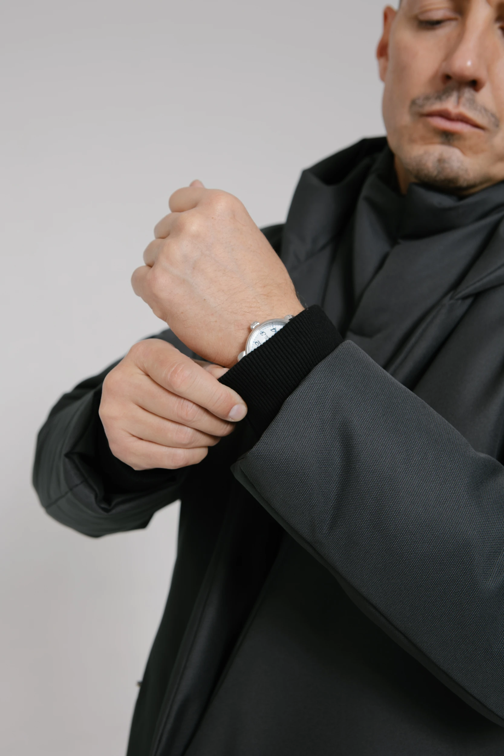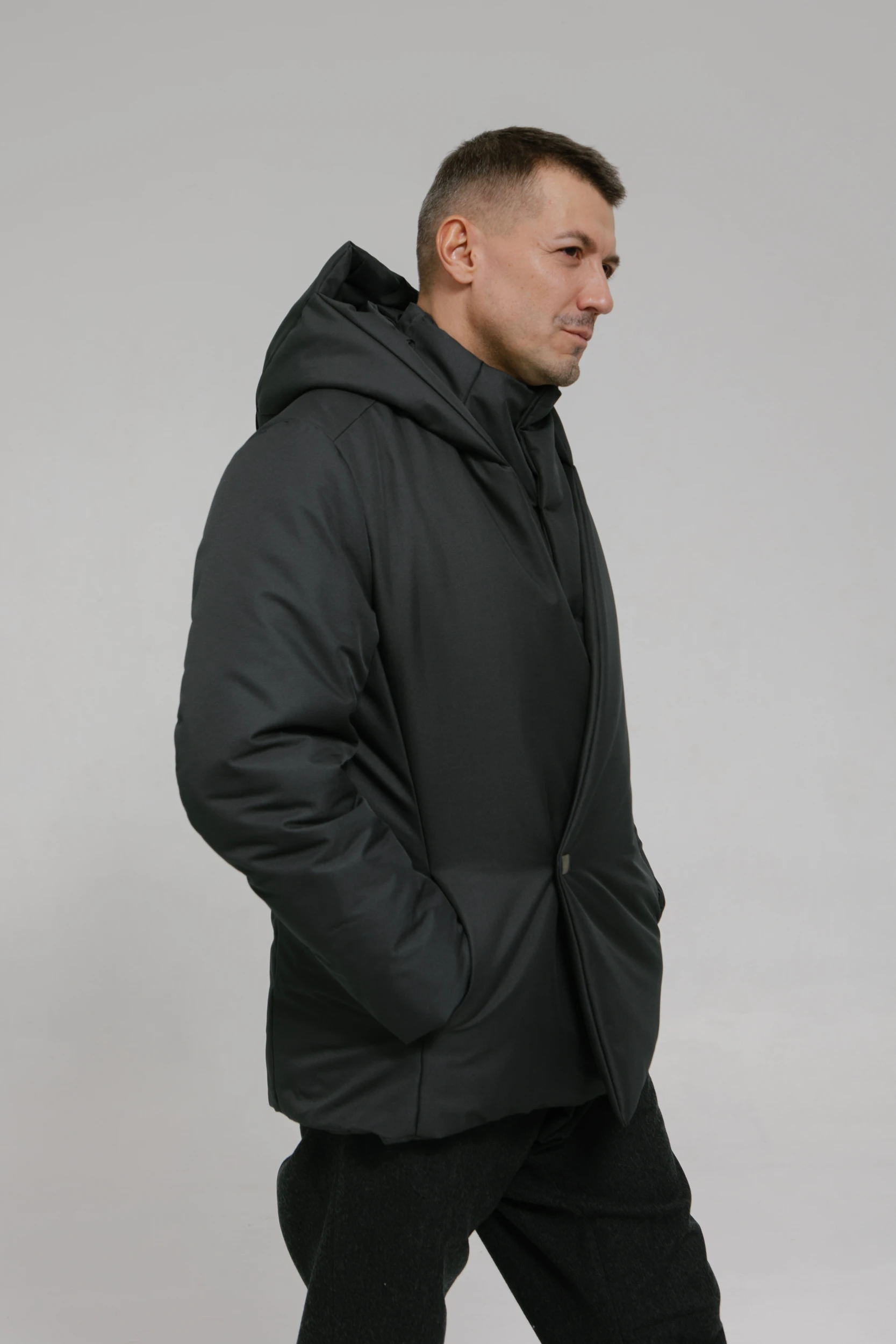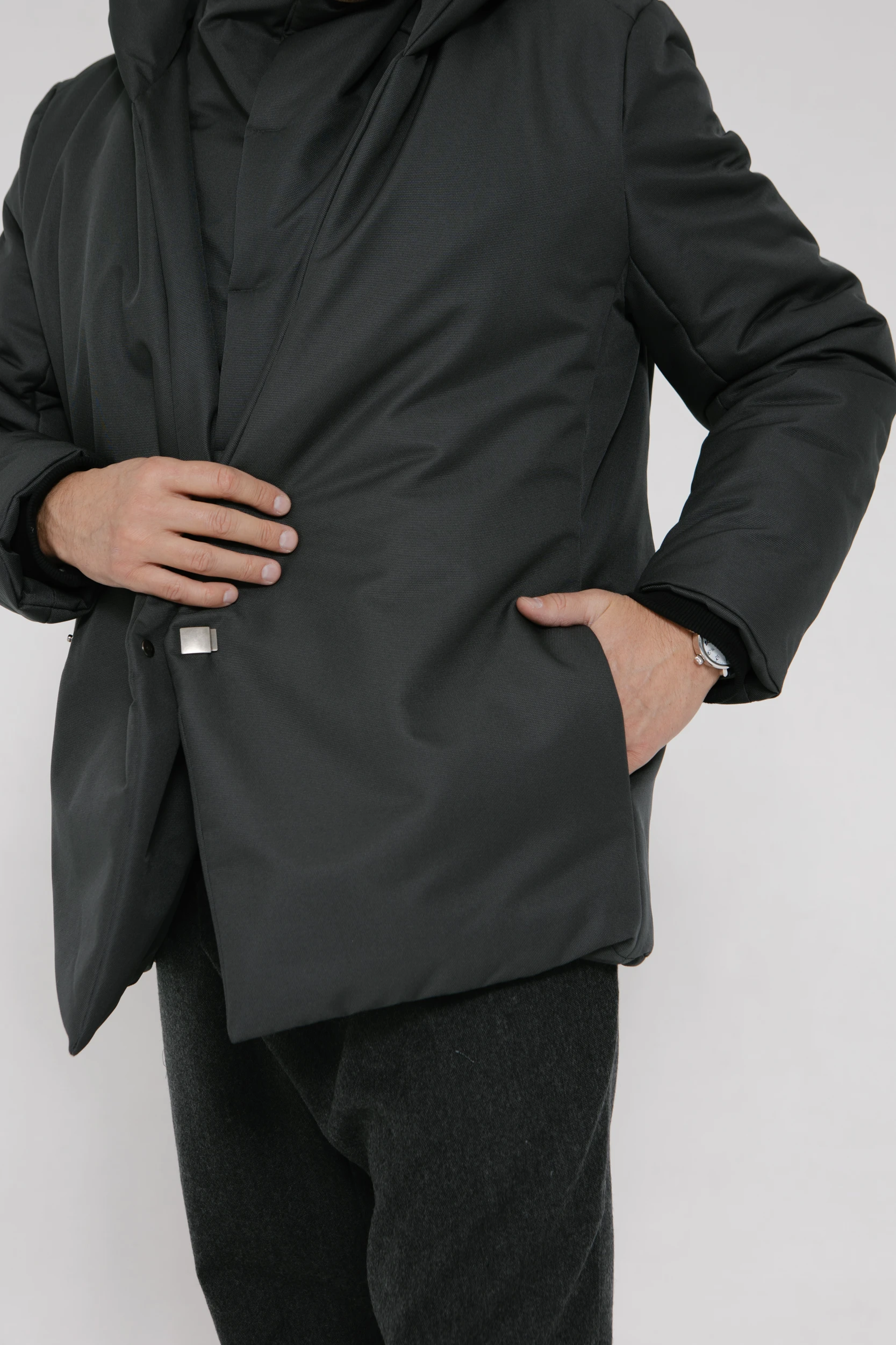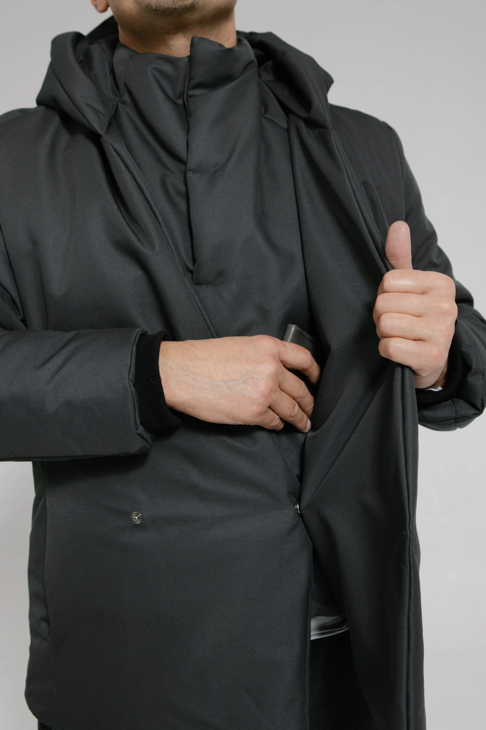 - Внутренний слой — как жилет с воротником-стойкой. Он вшит в переднюю часть куртки, застёгивается на неодимовые магниты и прилегает к телу, защищая от ветра и холода.