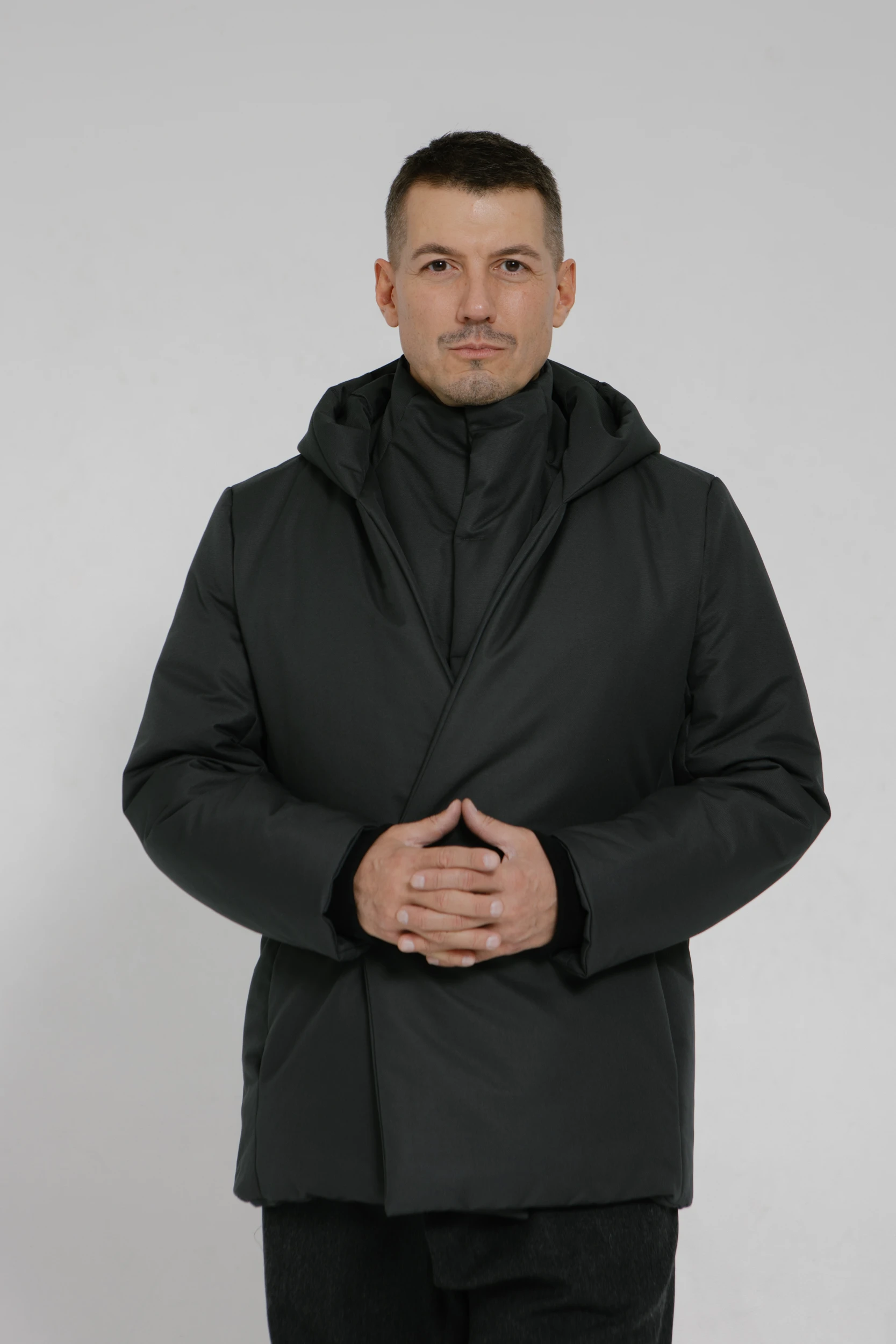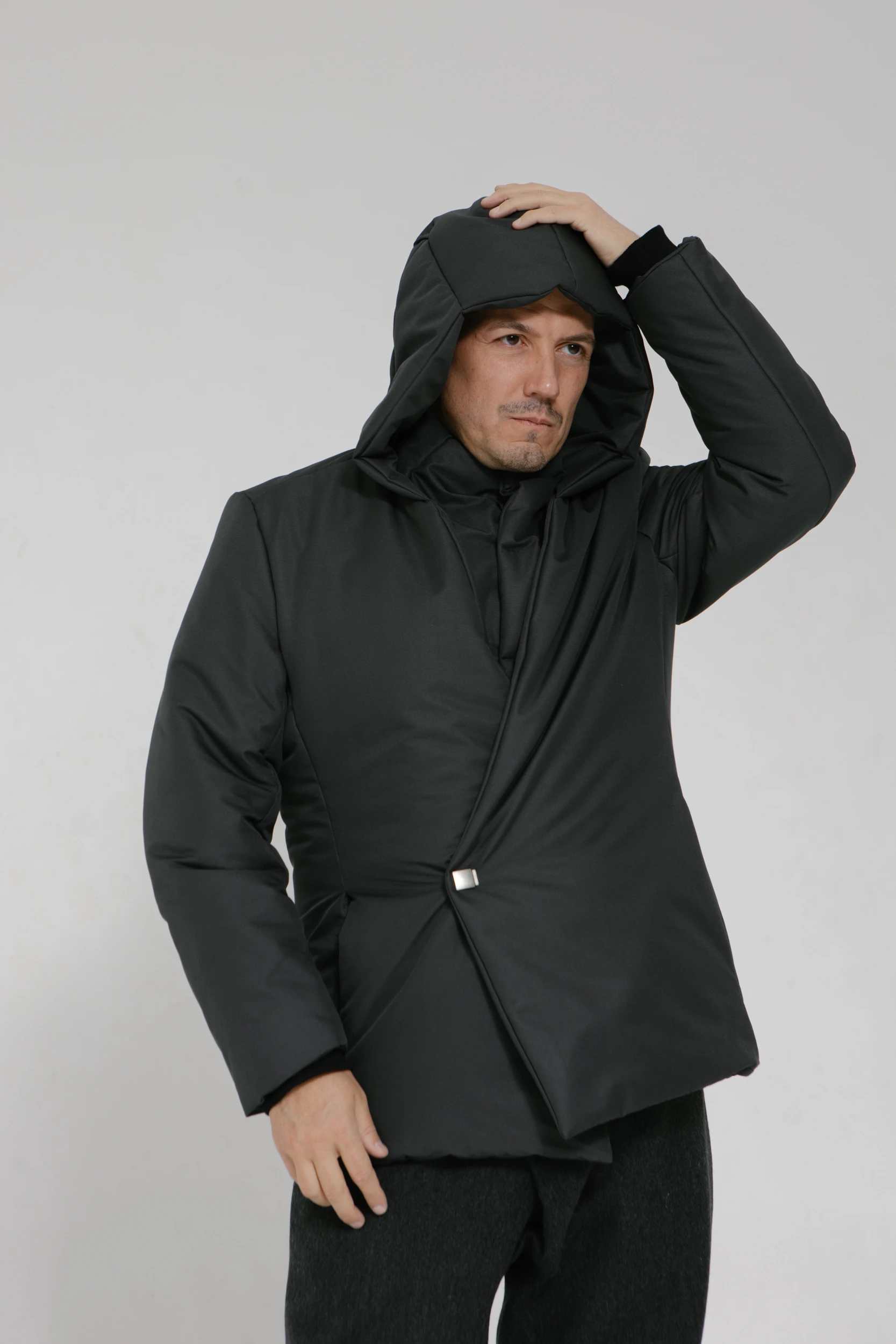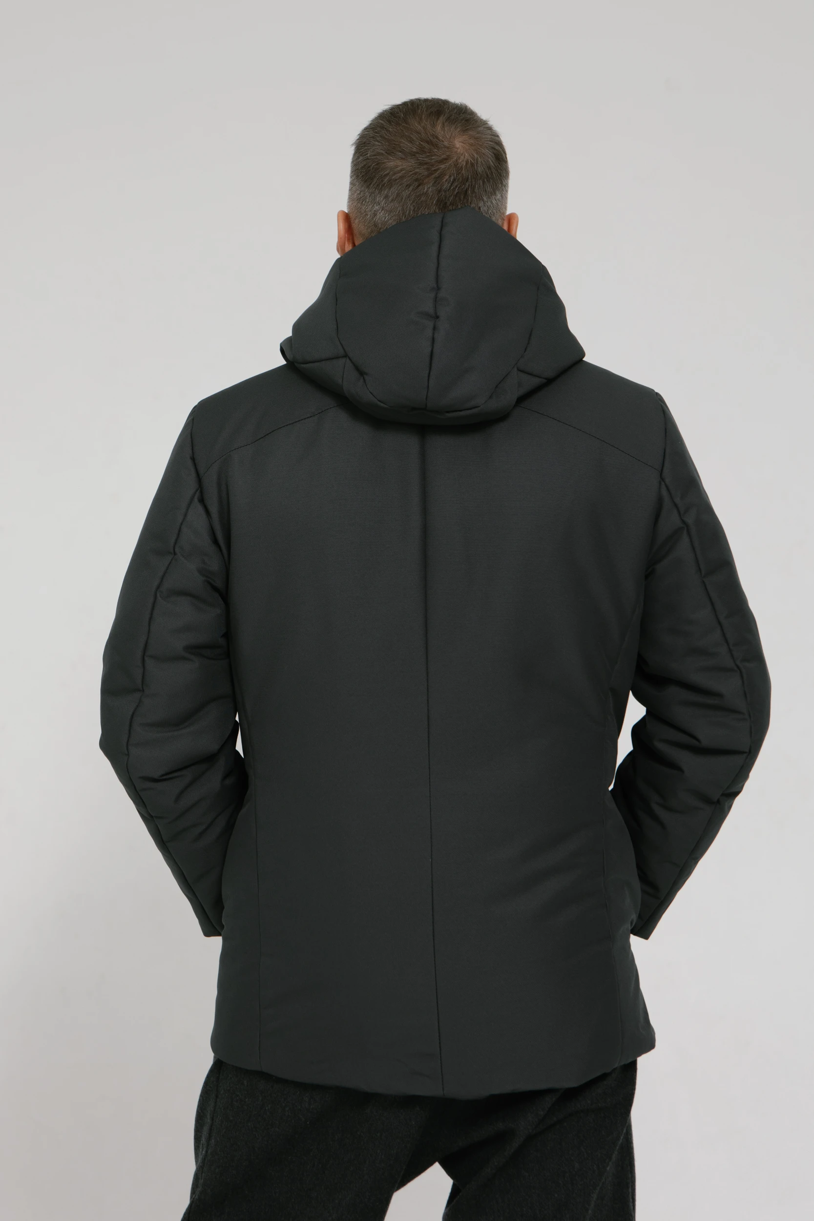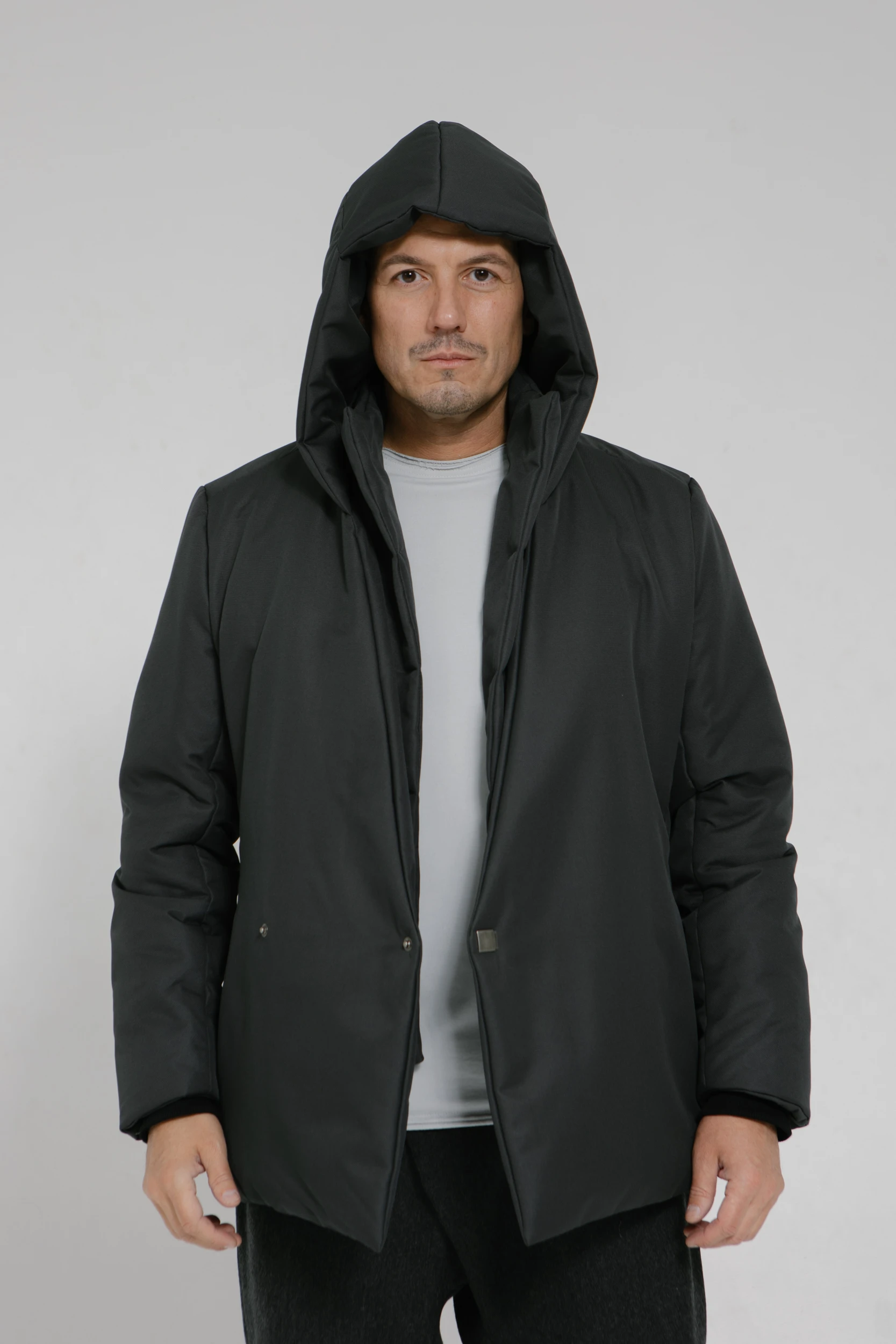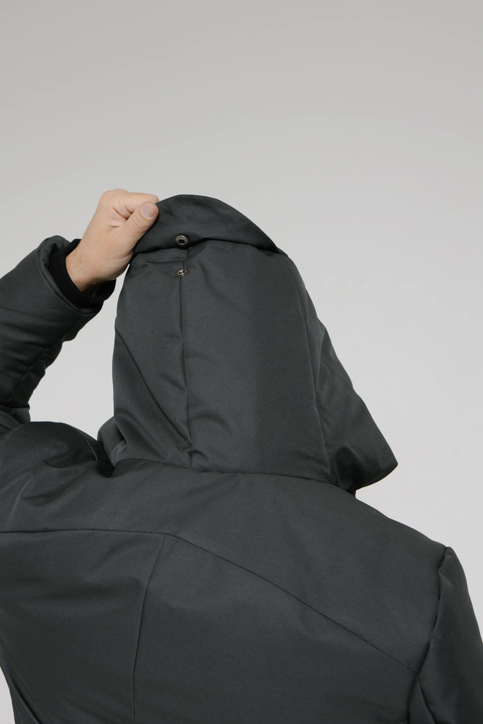 - Капюшон высокий, но не объёмный. Укрывает от ветра, снега и дождя, но не ограничивает поле зрения. Регулируется по высоте. Одним движением руки снимается с головы и аккуратно ложится на плечи.