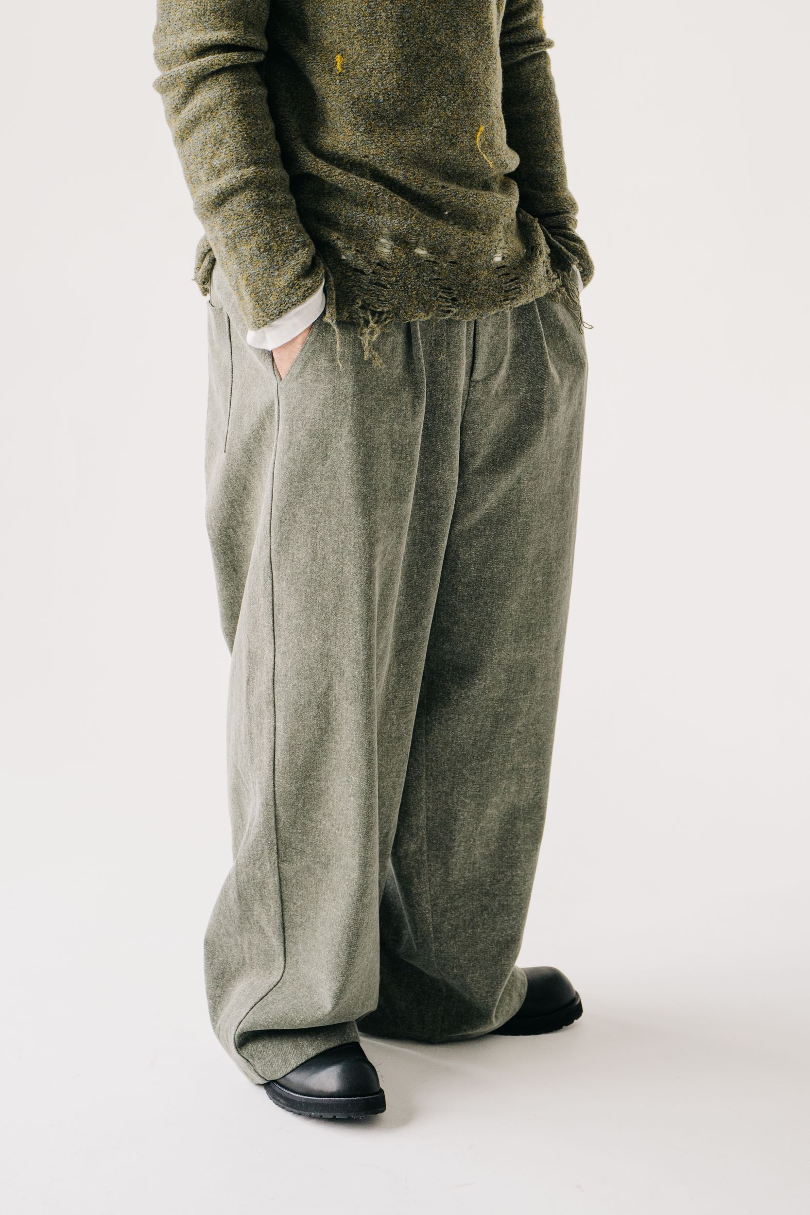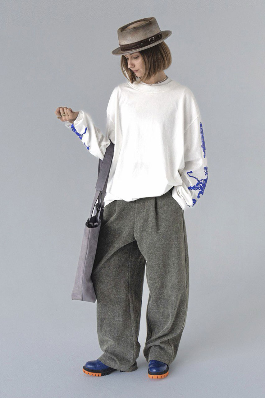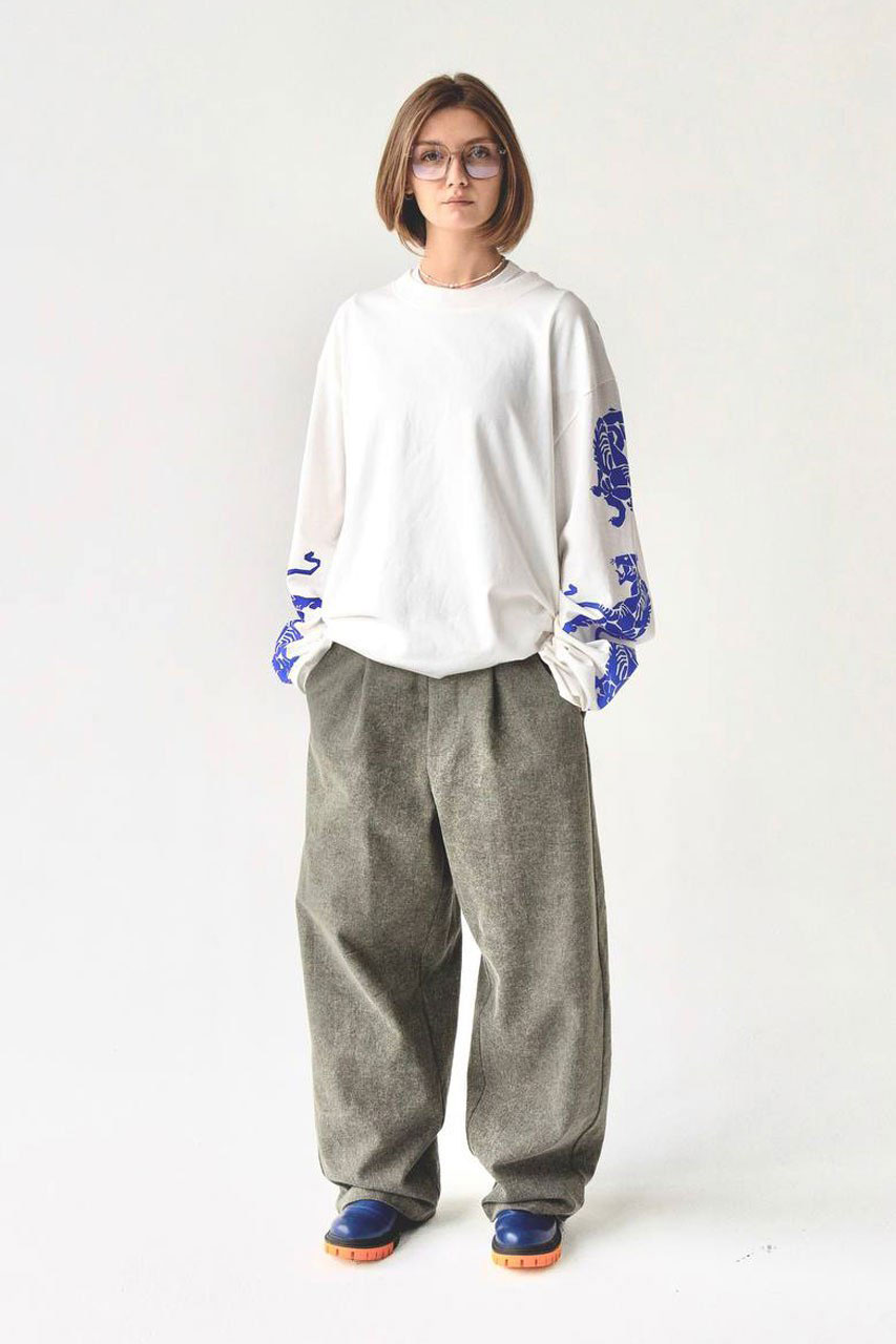 расслабленной. Посадка свободная, широкая, удлинённая—брюки не обнимают ногу, а выстраивают вокруг