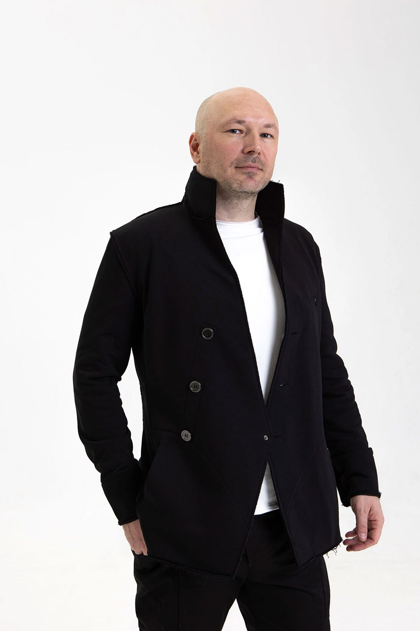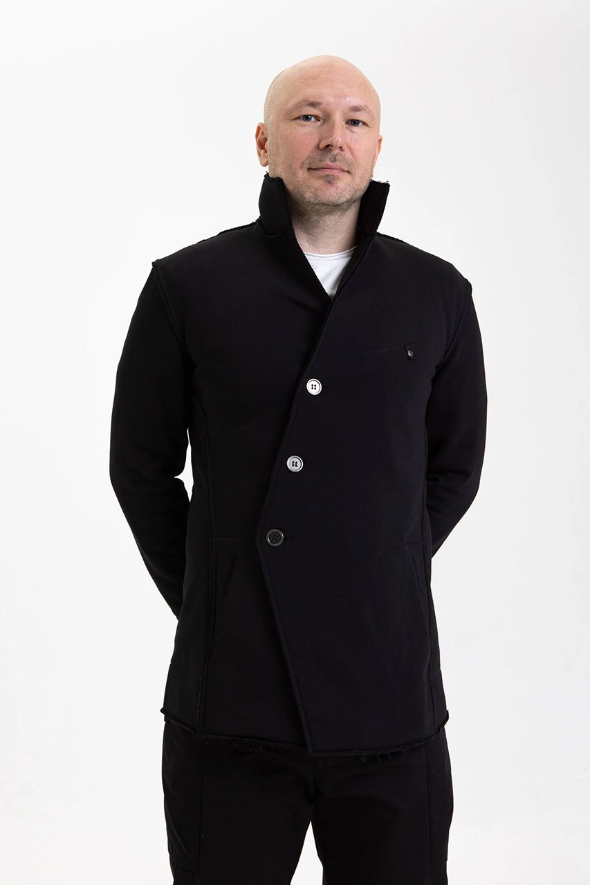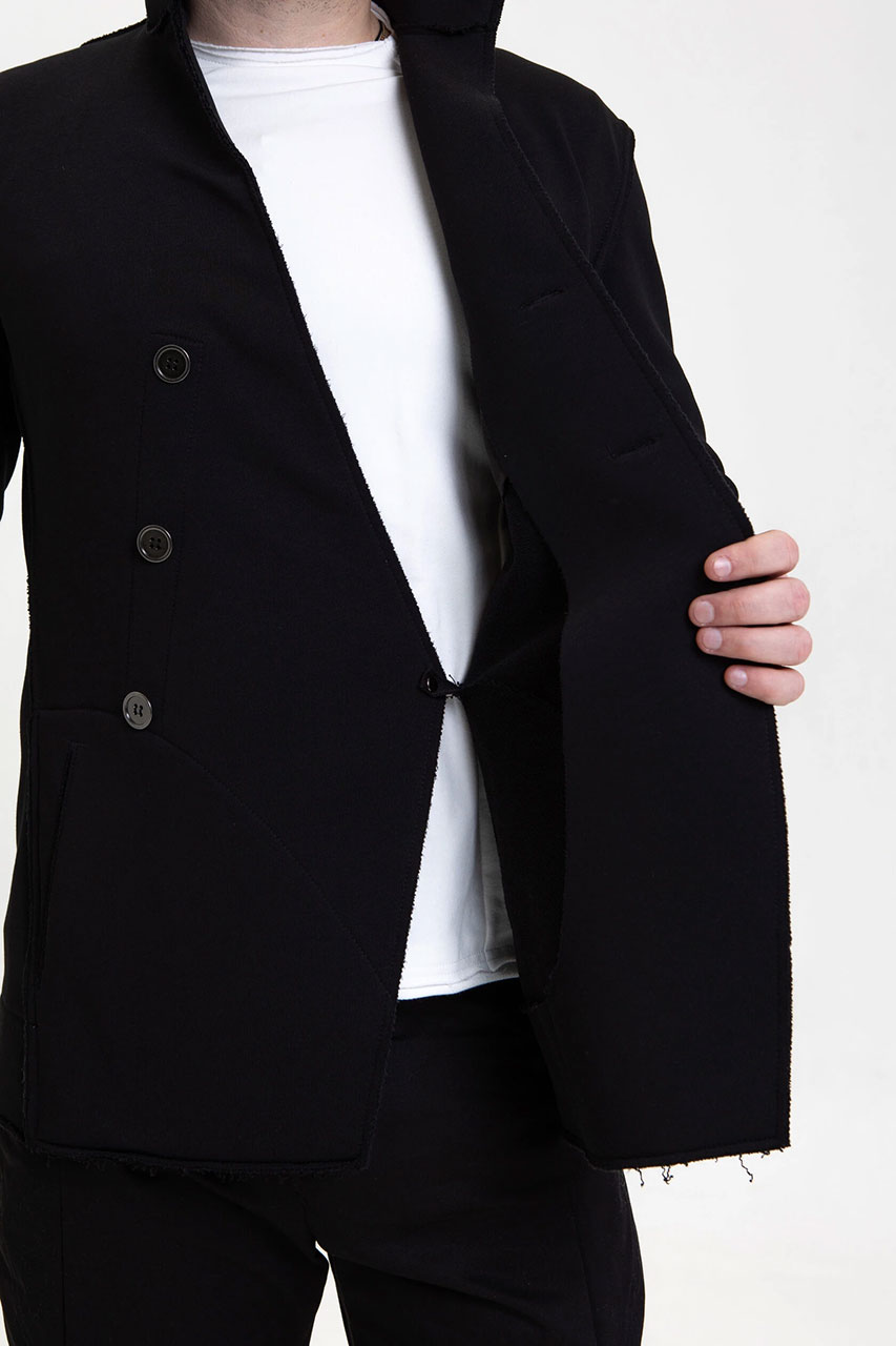 двубортный, с диагональной застёжкой на пуговицах и дополнительной