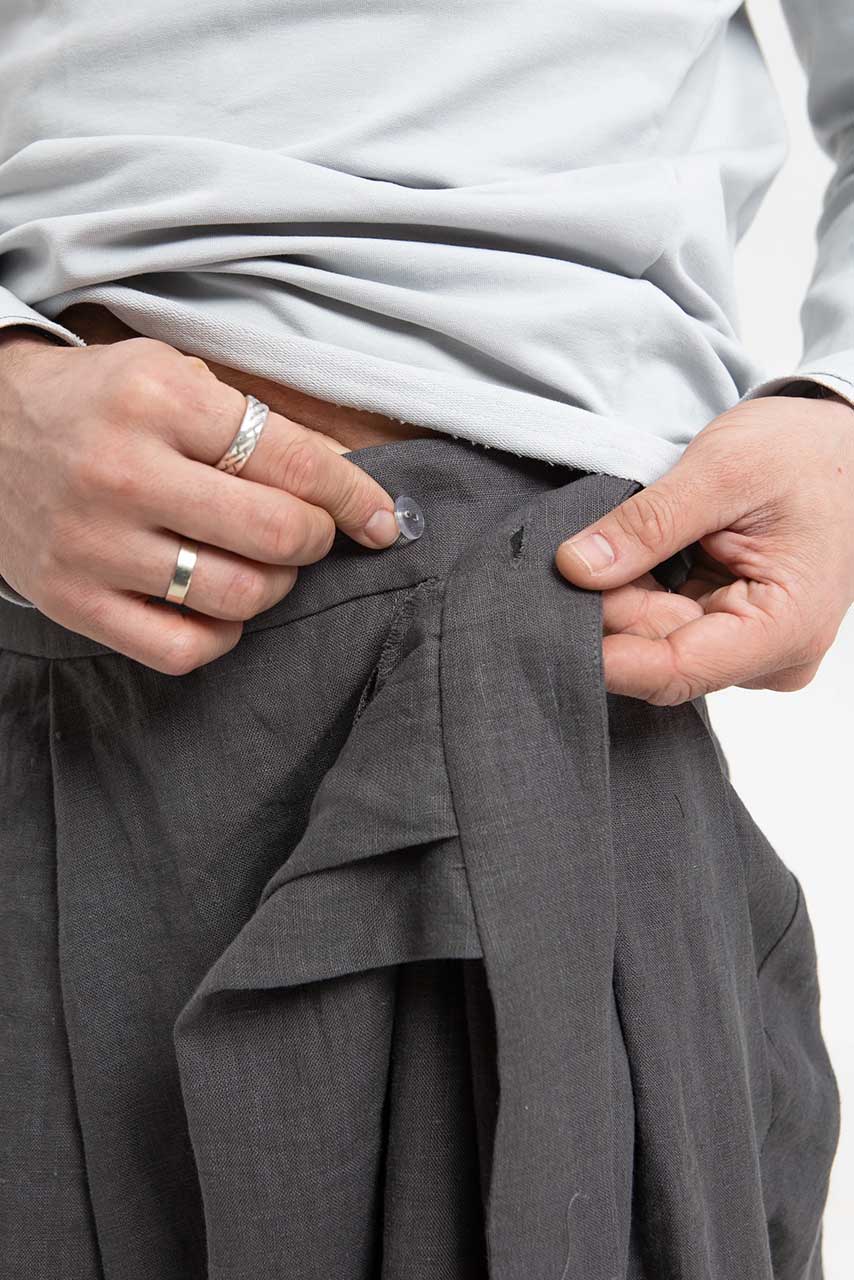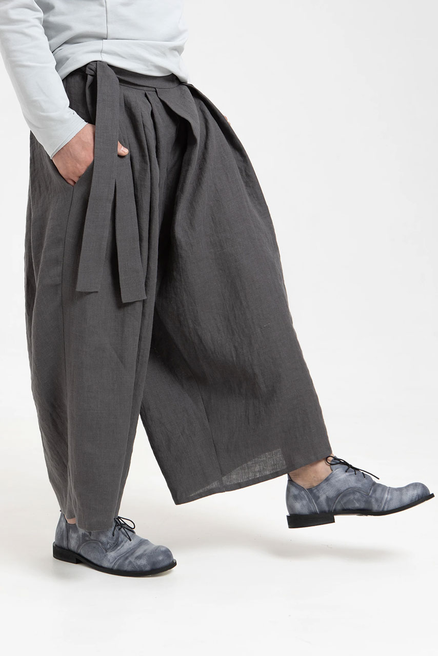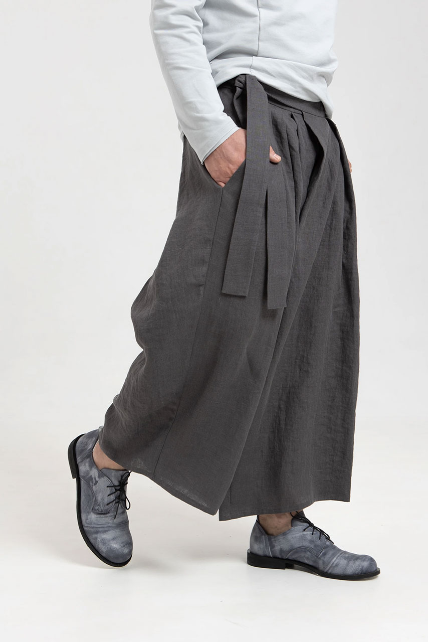 У брюк нет привычной застёжки — они, как настоящие самурайские штаны, завязываются на пояс.