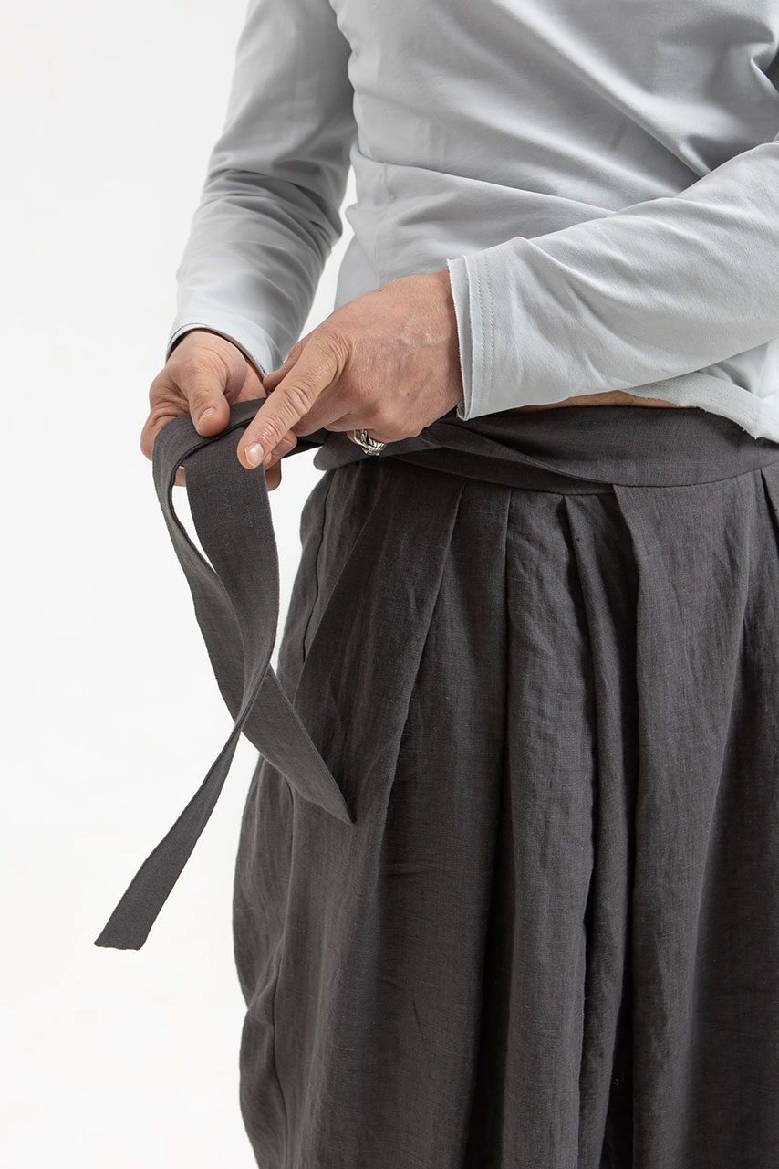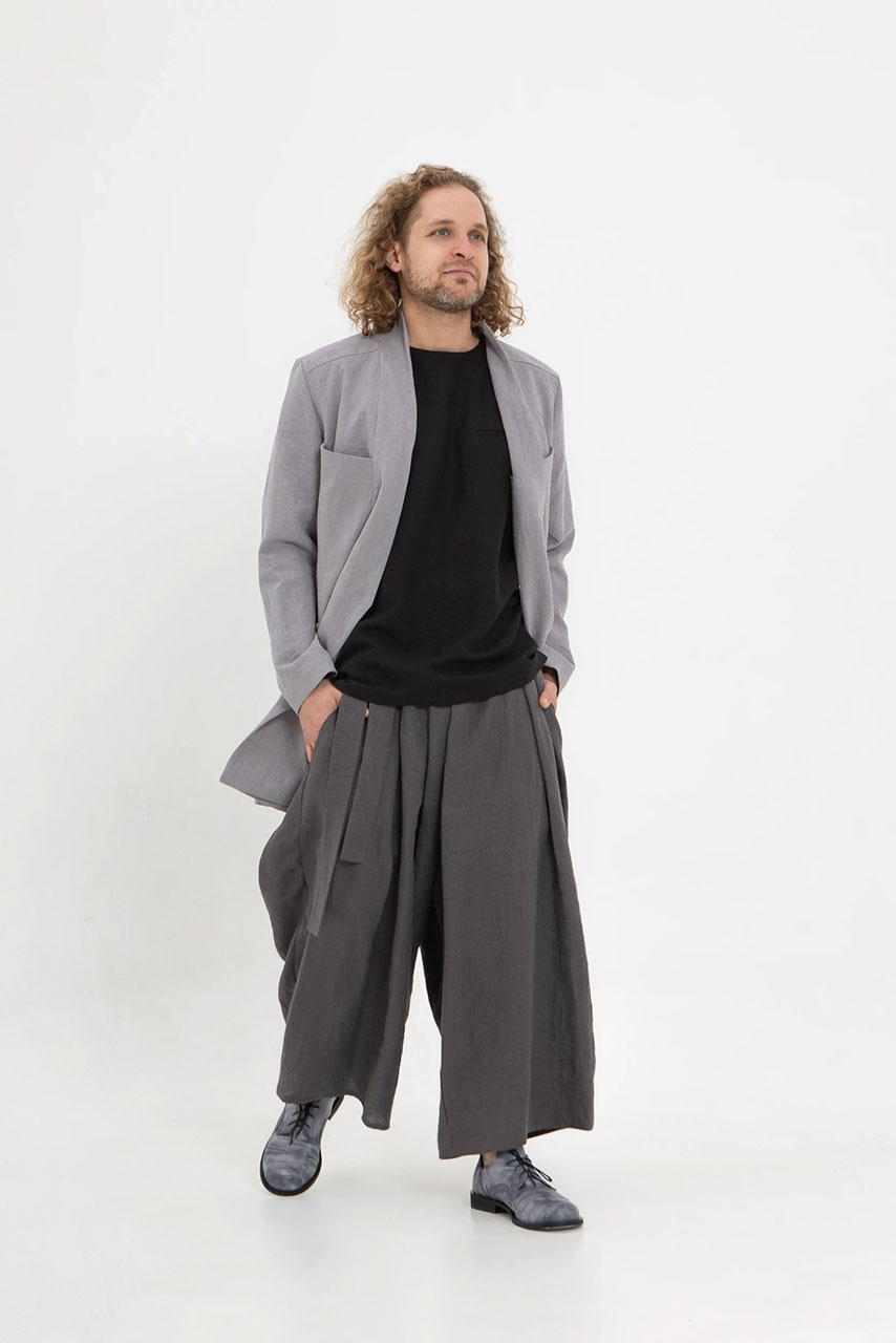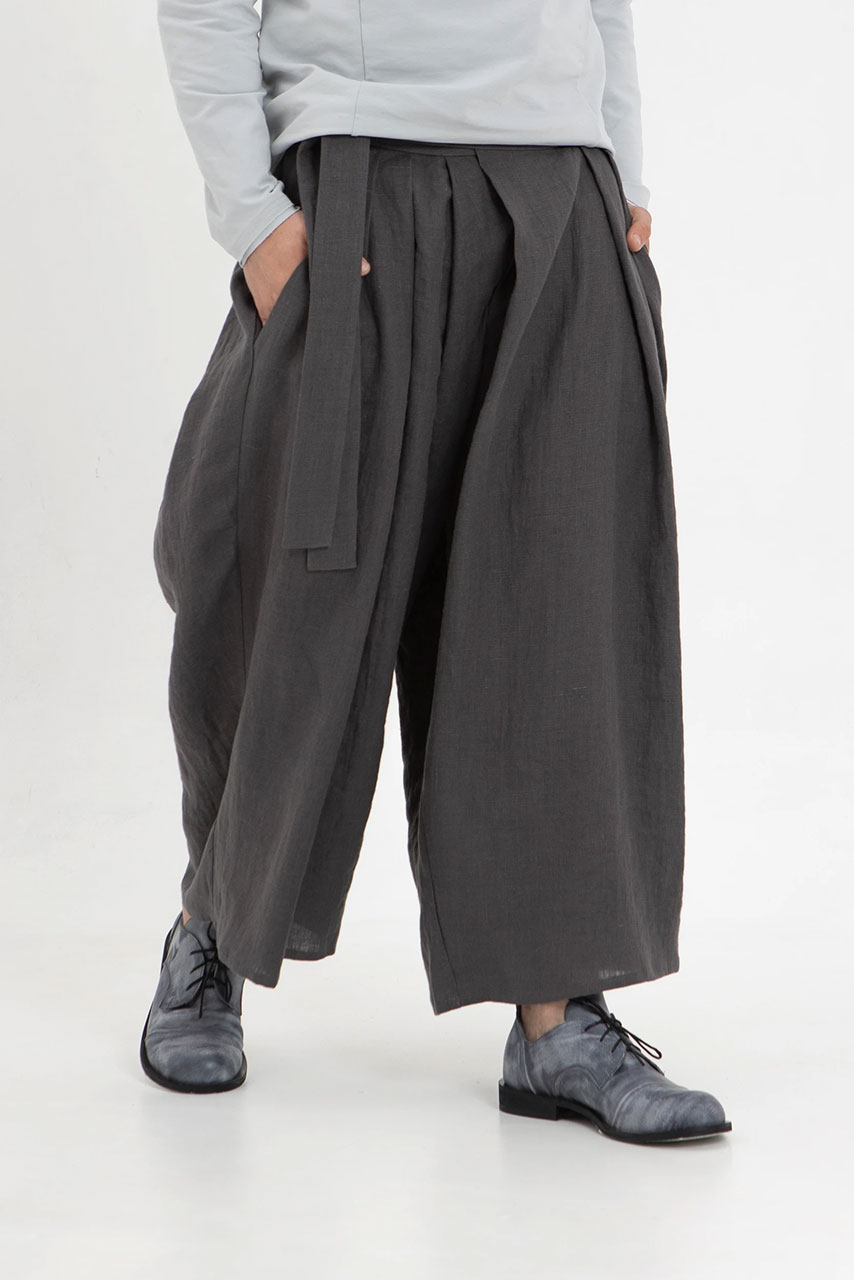 У брюк нет привычной застёжки — они, как настоящие самурайские штаны, завязываются на пояс.