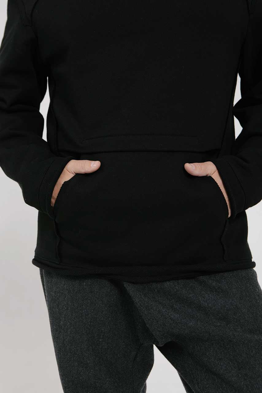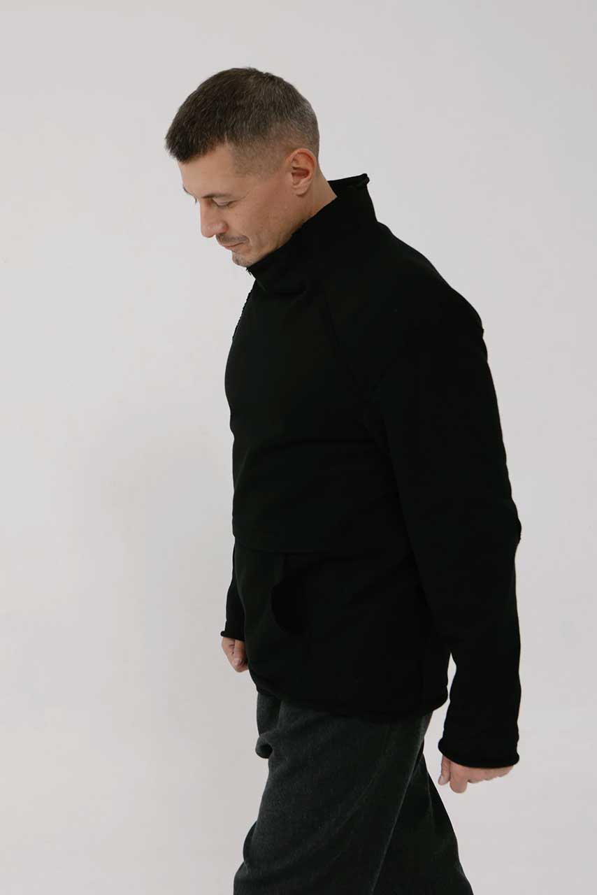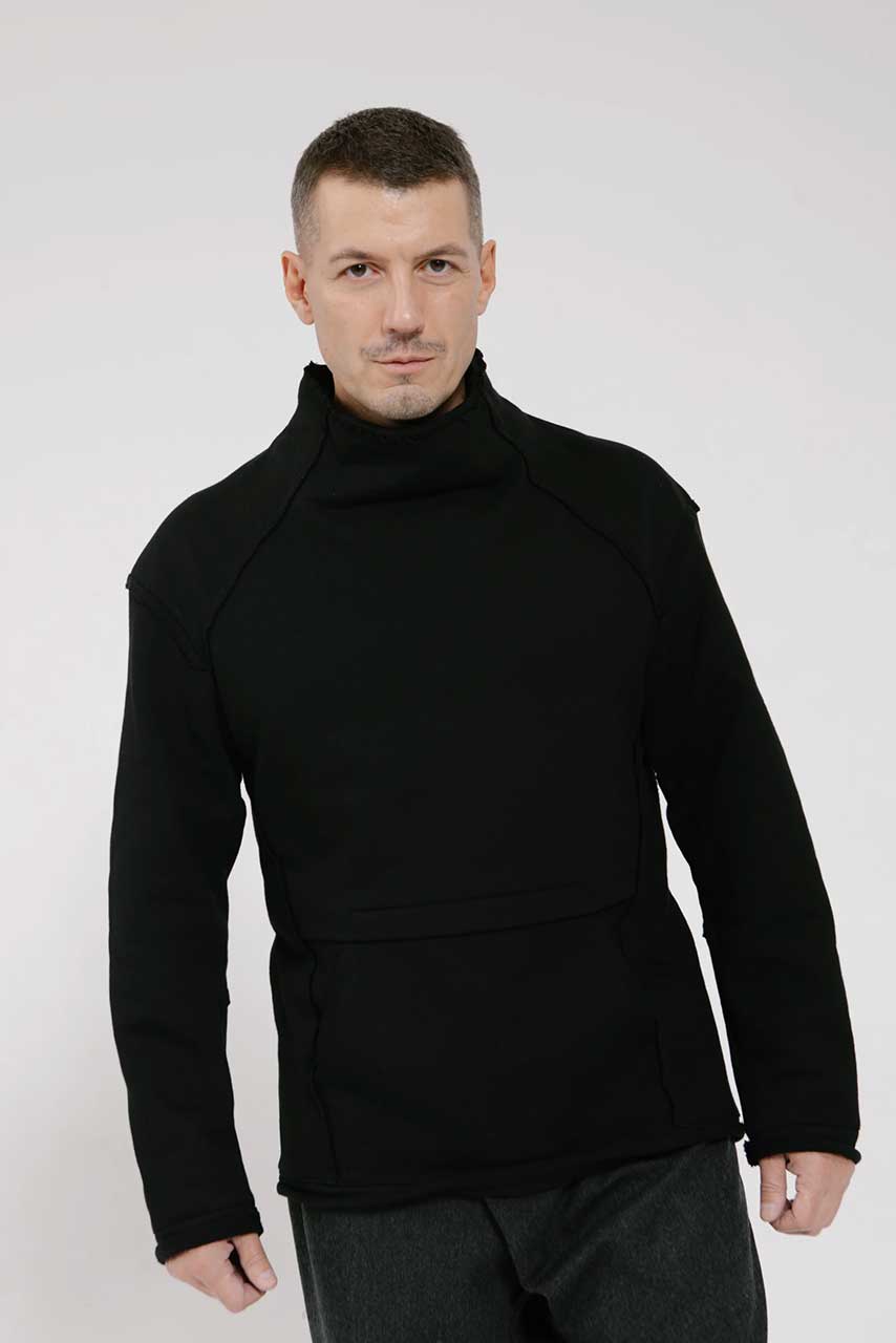Спереди у свитера — новое прочтение привычного кармана кенгуру. Вроде спортивный,
