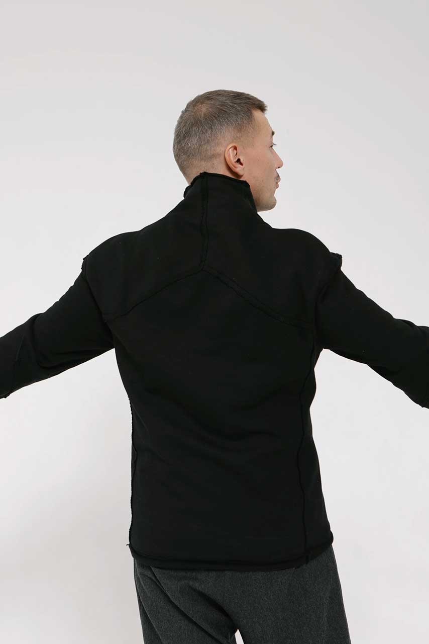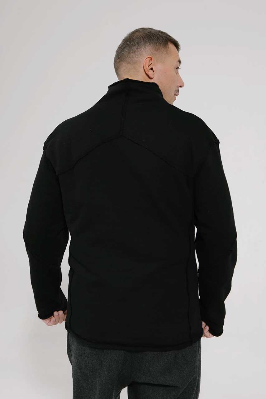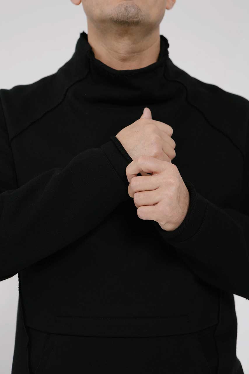 Спереди у свитера — новое прочтение привычного кармана кенгуру. Вроде спортивный,