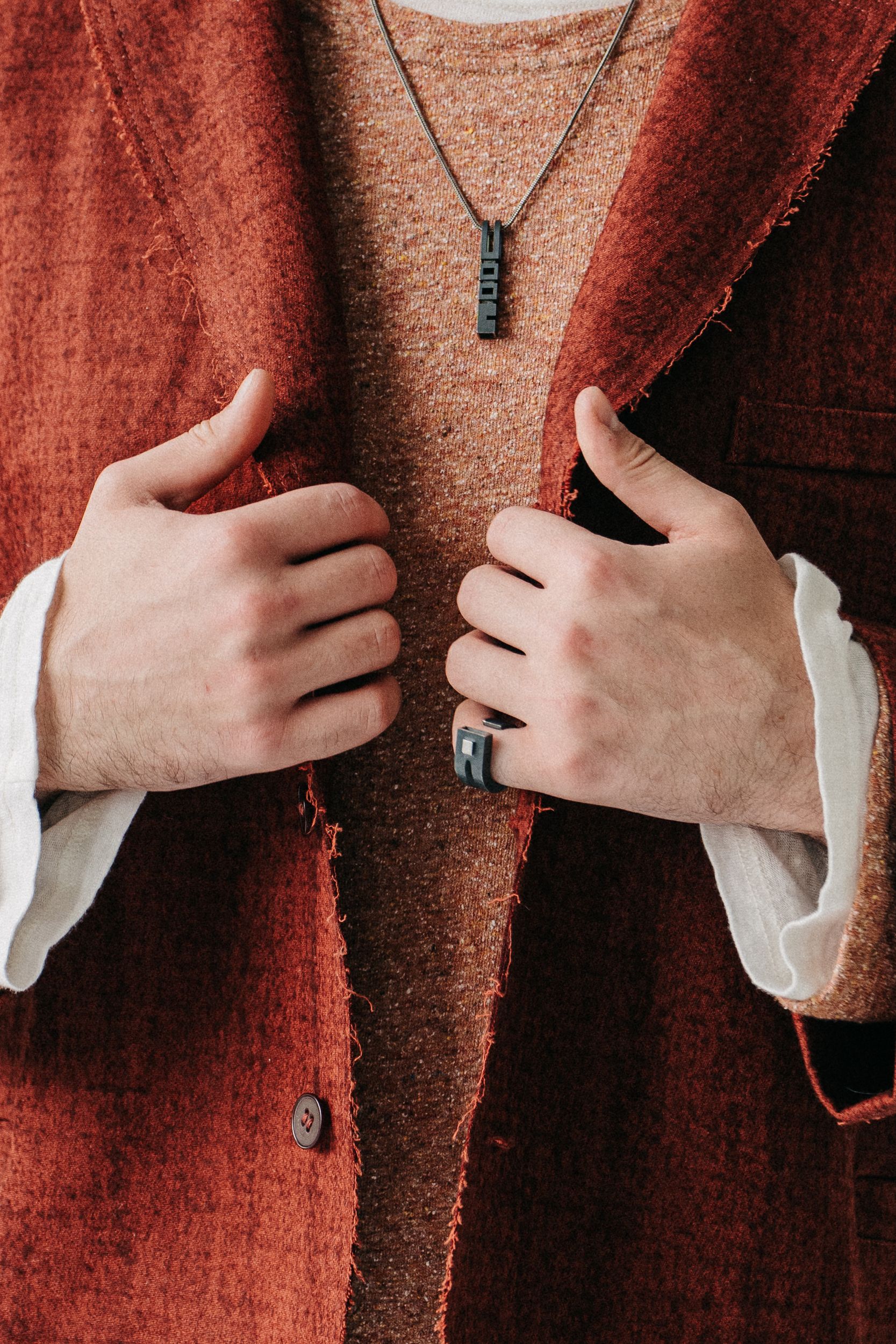 кирпичная кладка. Он не кричит, но притягивает взгляд, делая пиджак самый красивый