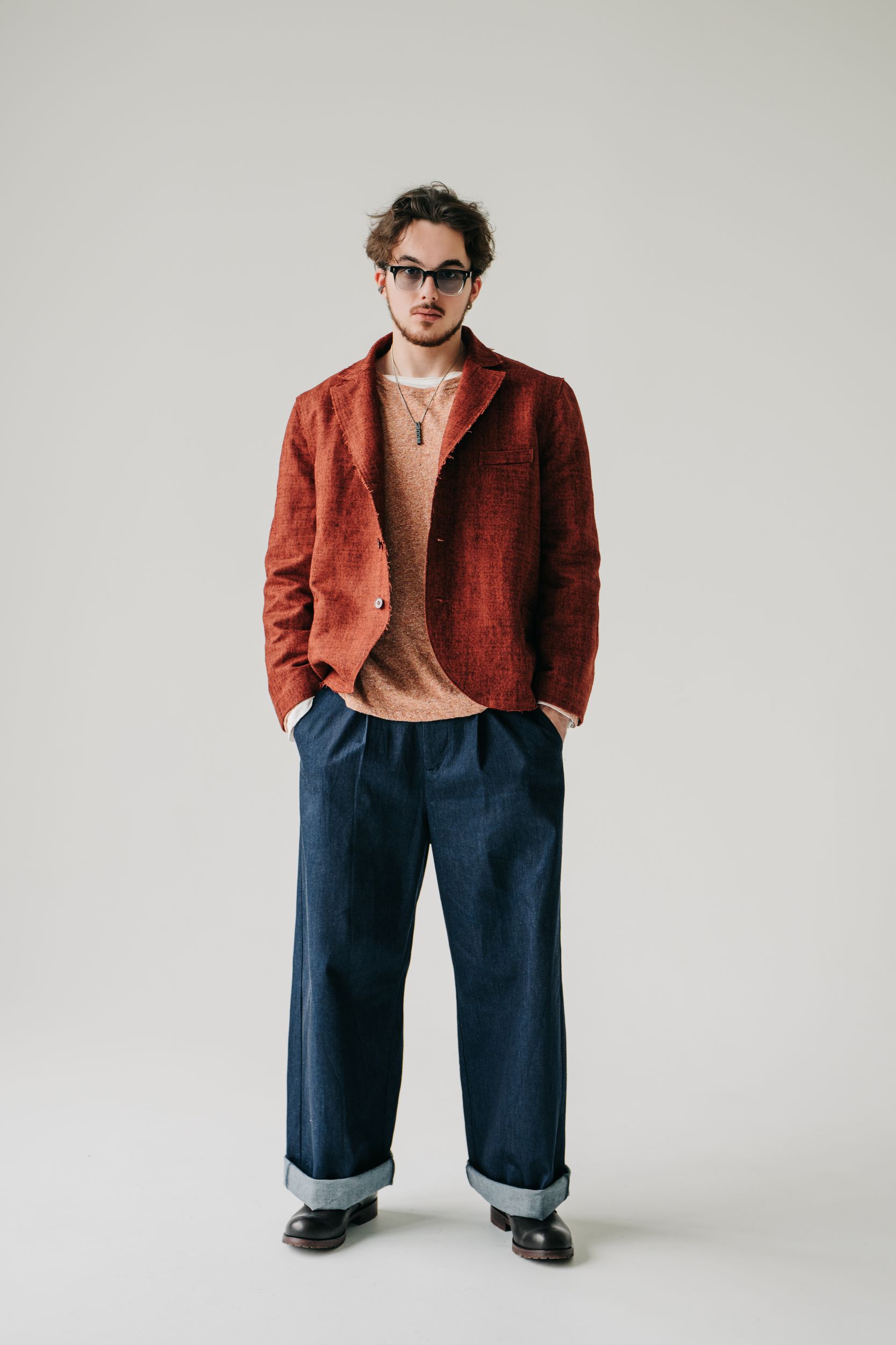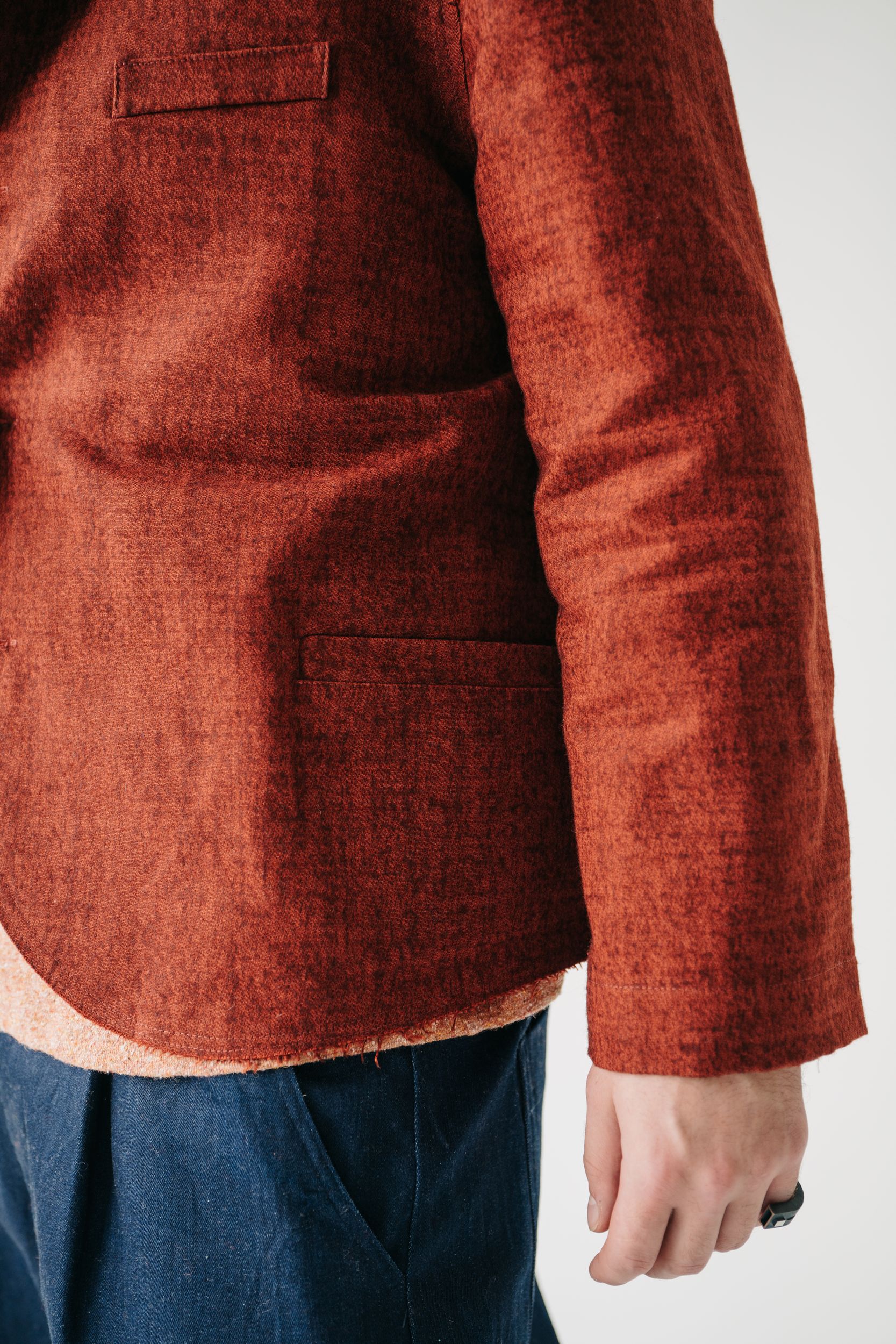 Пиджак выполнен из плотной шерсти, похожей на канвас, с добавлением хлопка.