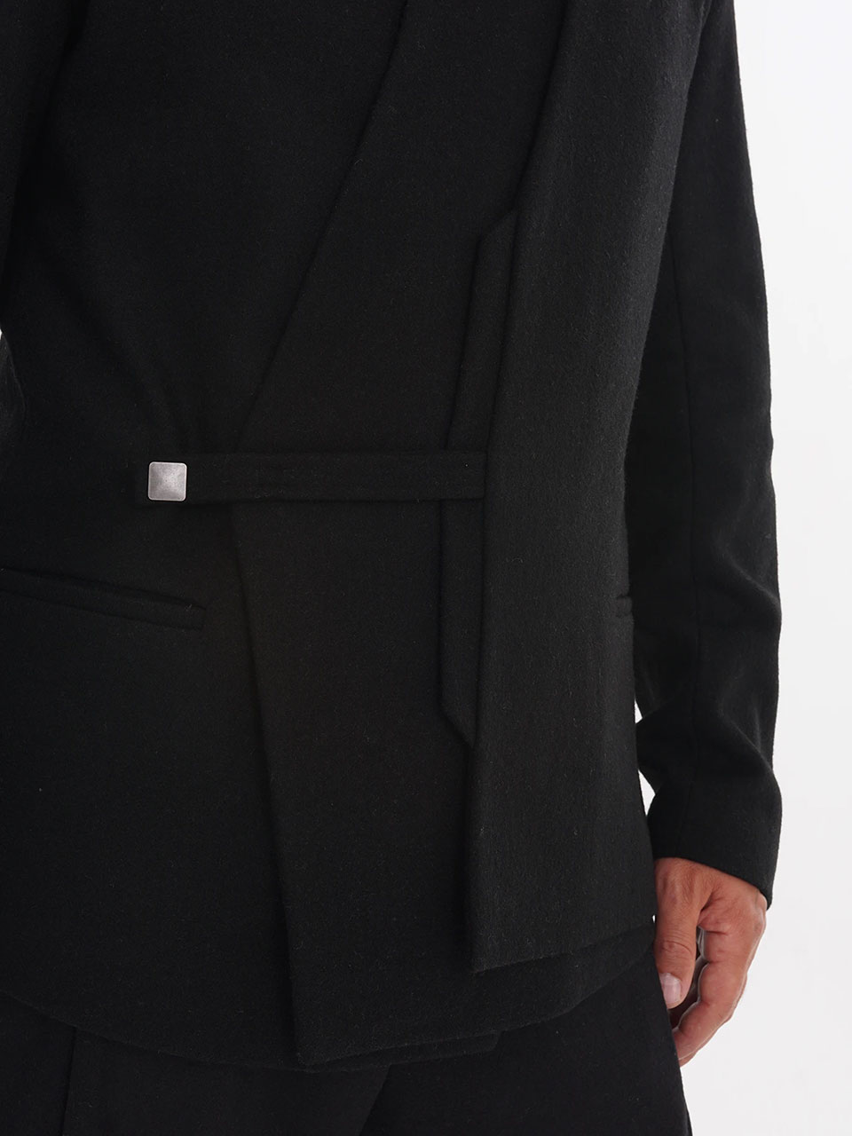 Спереди по бокам — два графичных горизонтальных кармана для рук или необходимых мелочей. Графику жакета поддерживает и хлястик-застёжка с квадратной кнопкой.