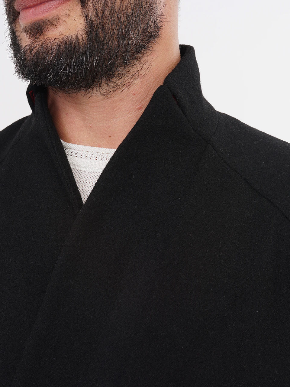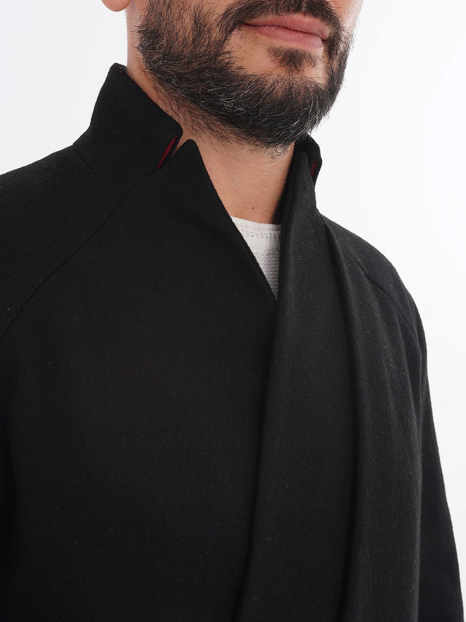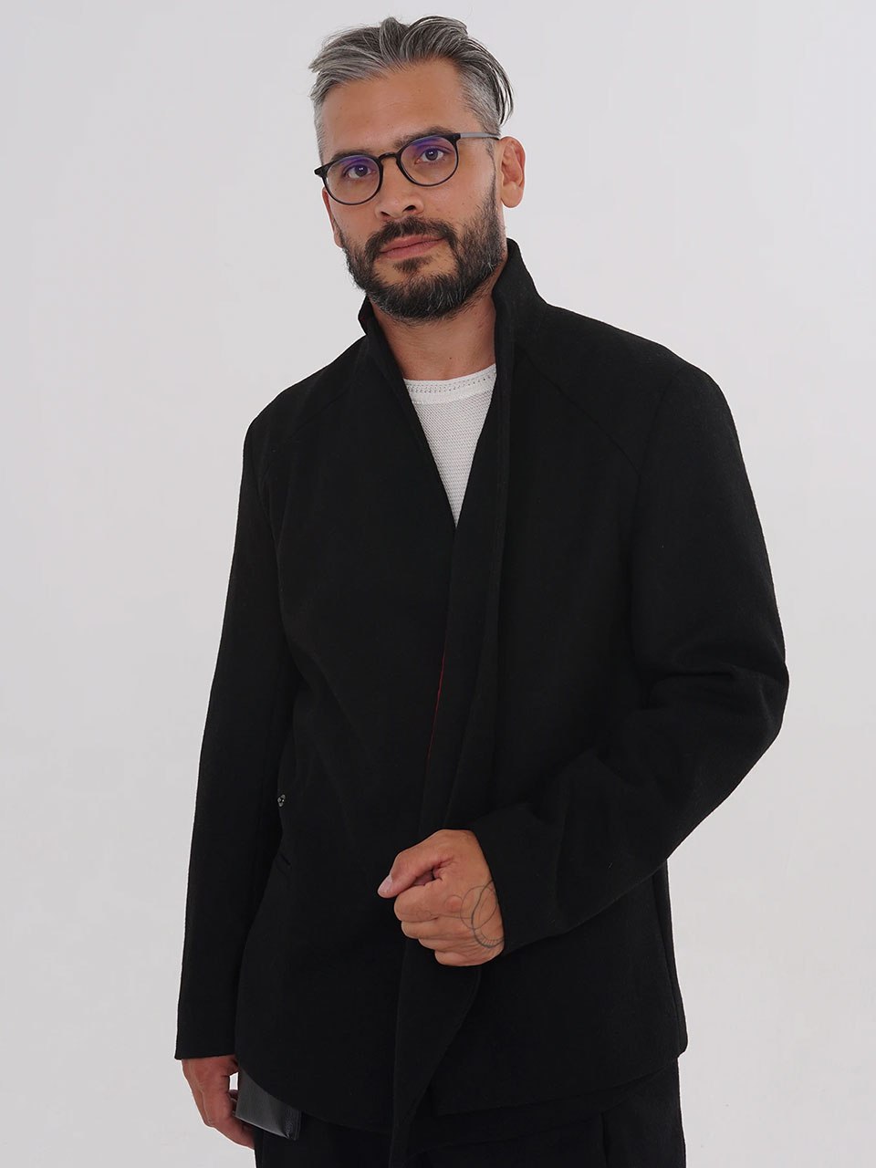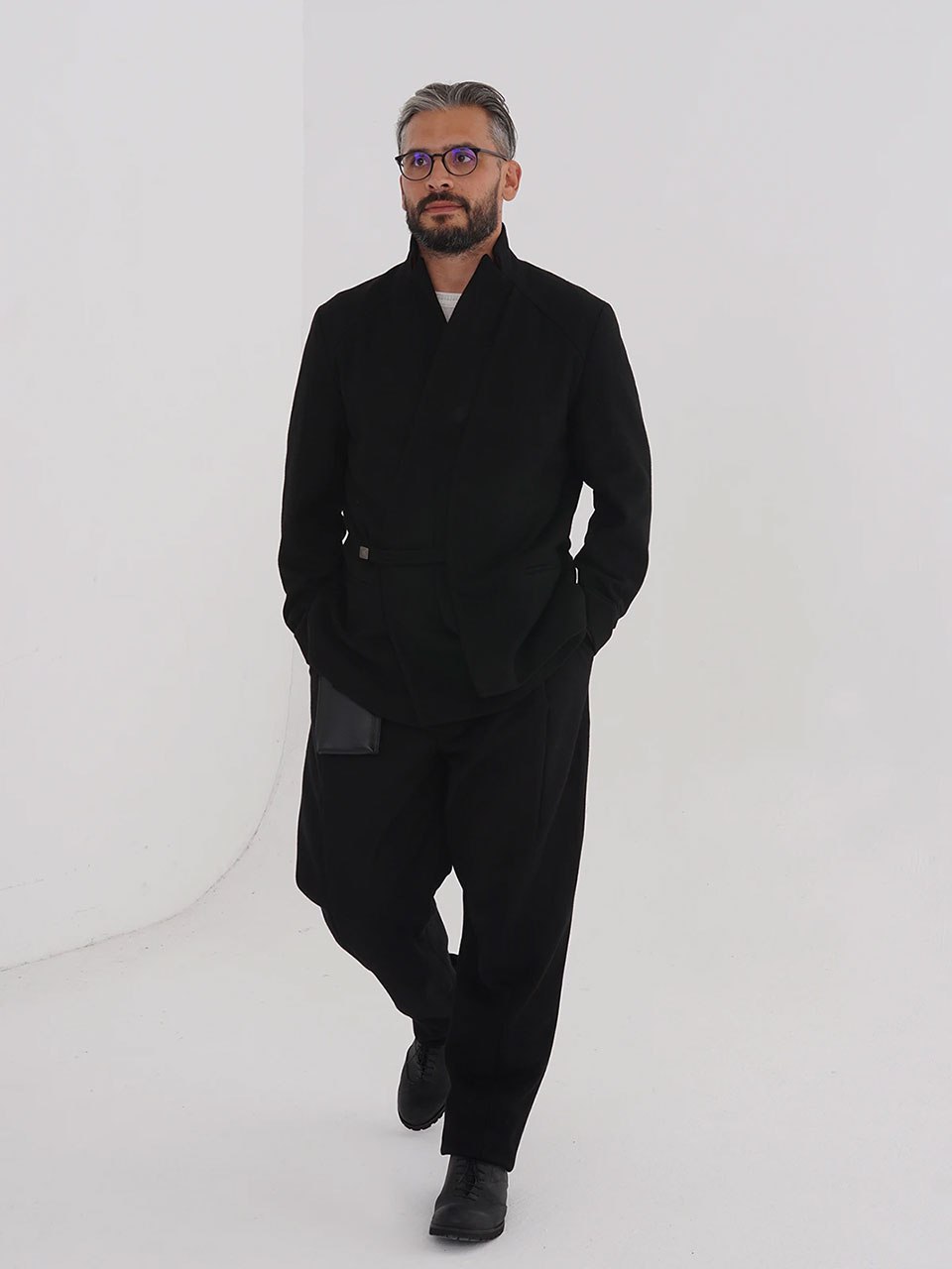 Лёгкая отсылка к мотивам кимоно — за счёт линий лацканов и многослойности, появившейся с асимметричной передней деталью, которая скрывает нагрудный карман.
