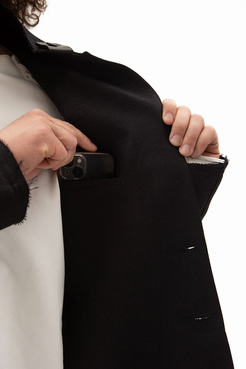 Спереди — два кармана в швах и один прорезной классический карман с листочкой — внутри.