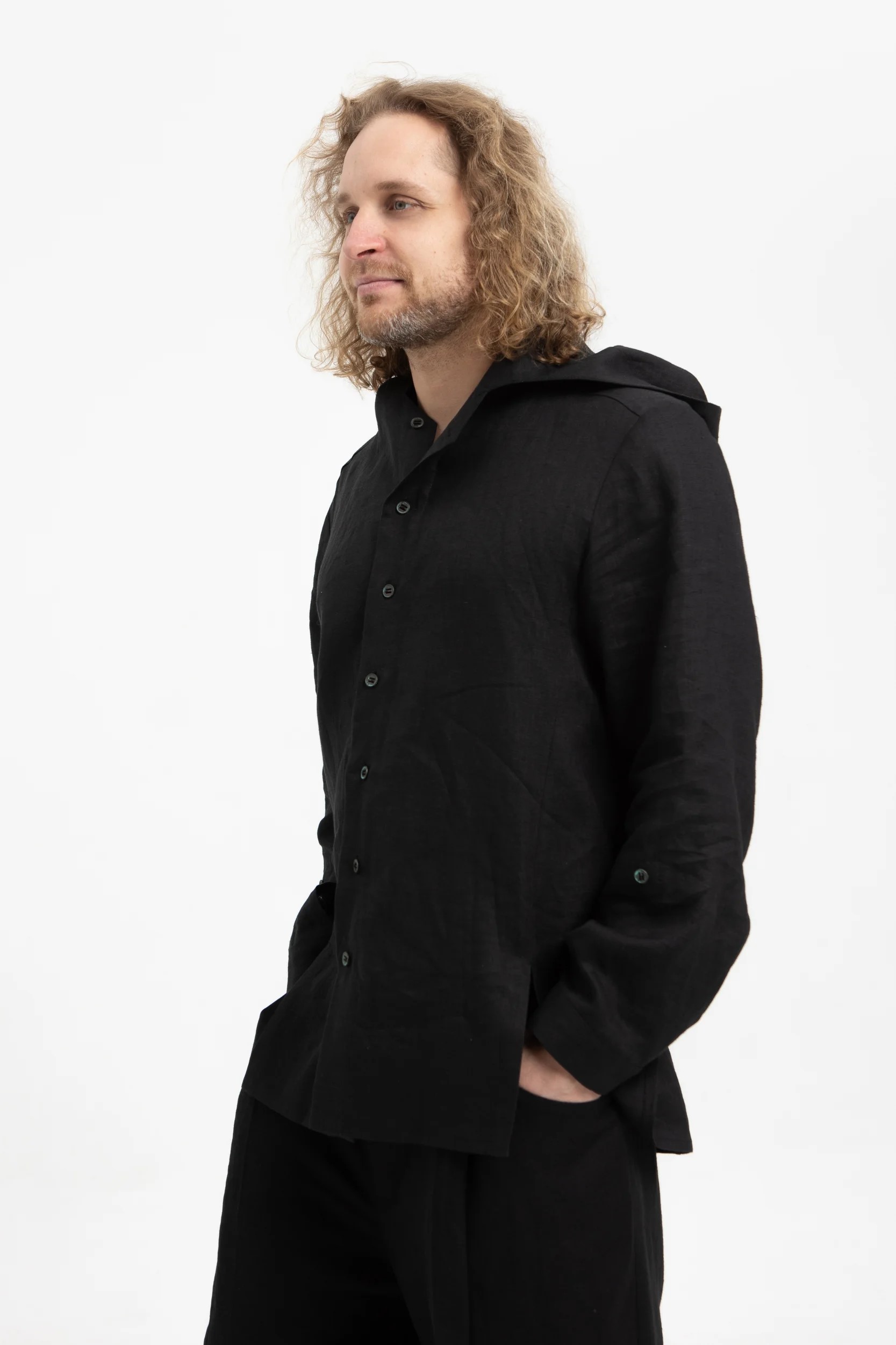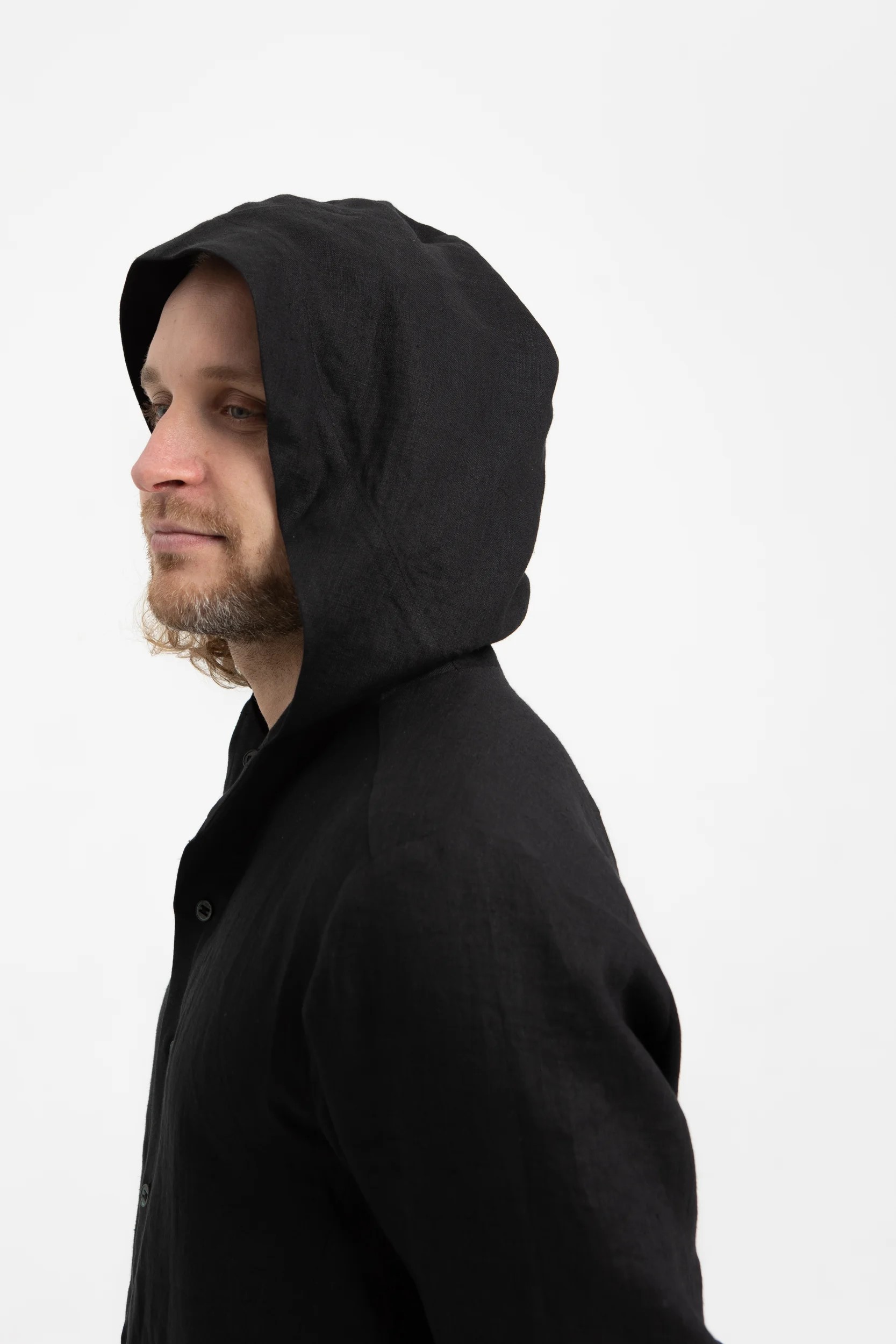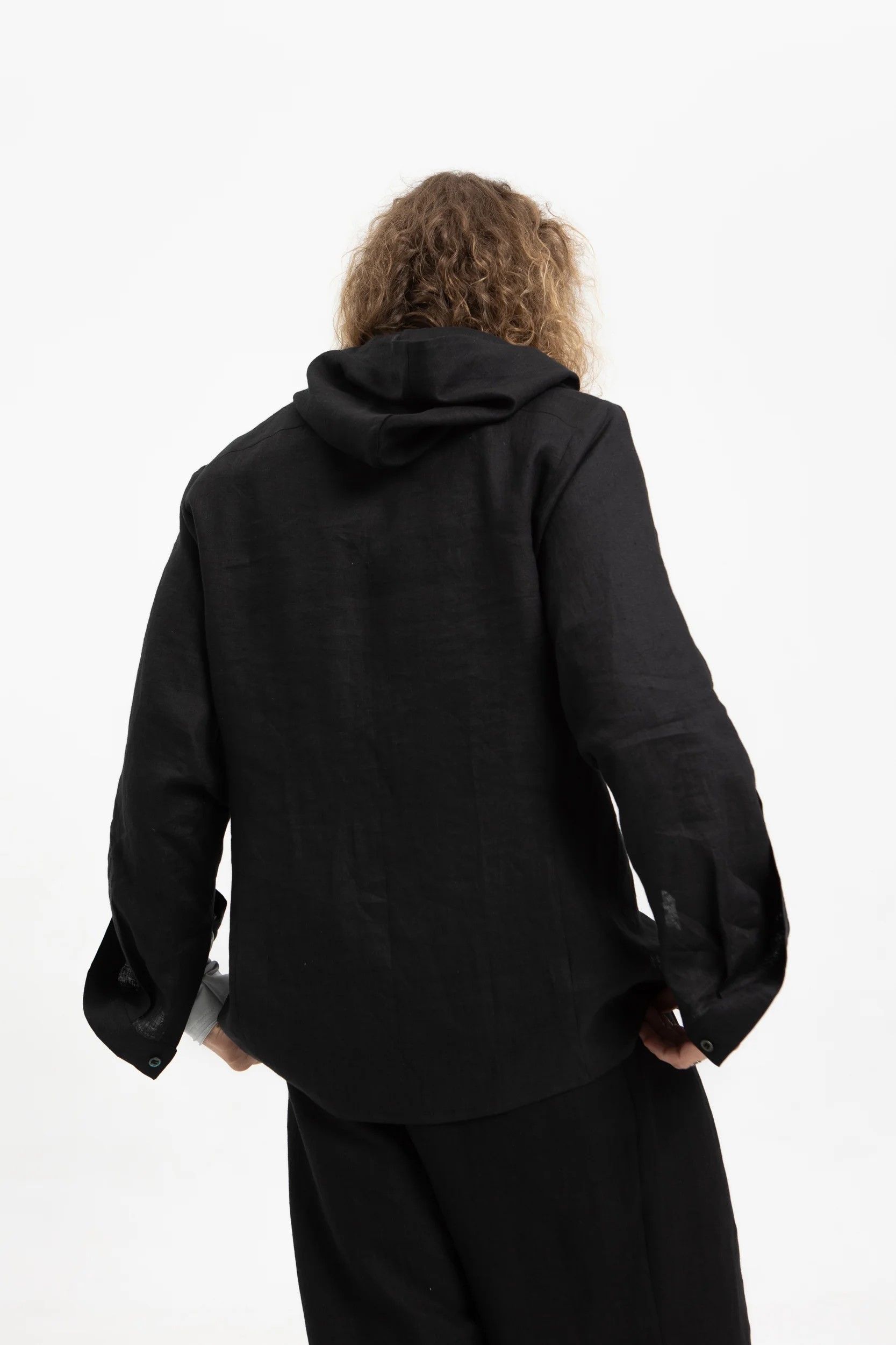 Льняная черная рубашка с капюшоном