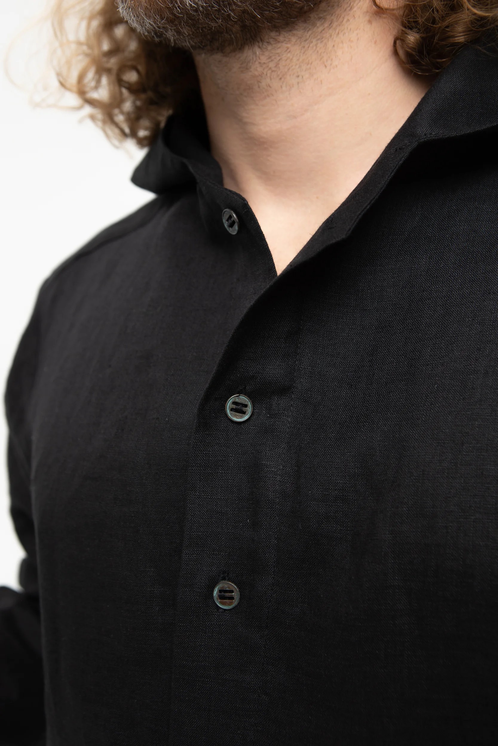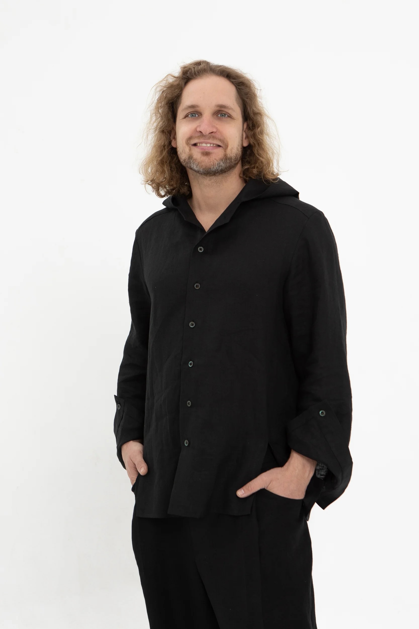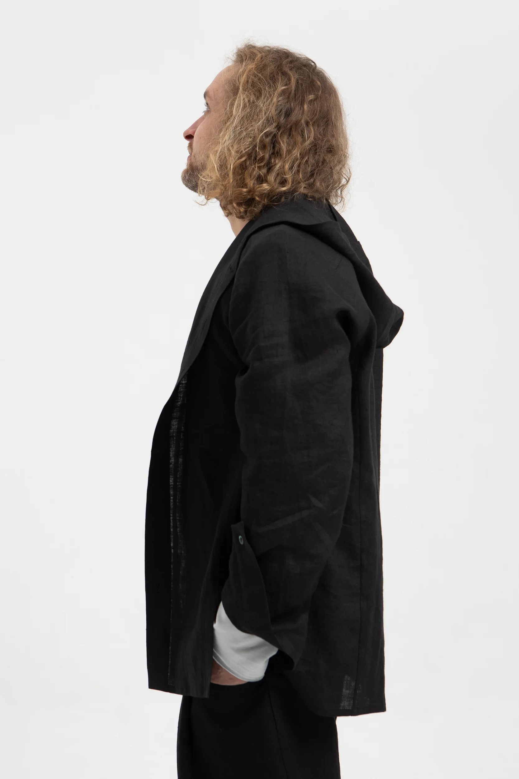 Льняная черная рубашка с капюшоном