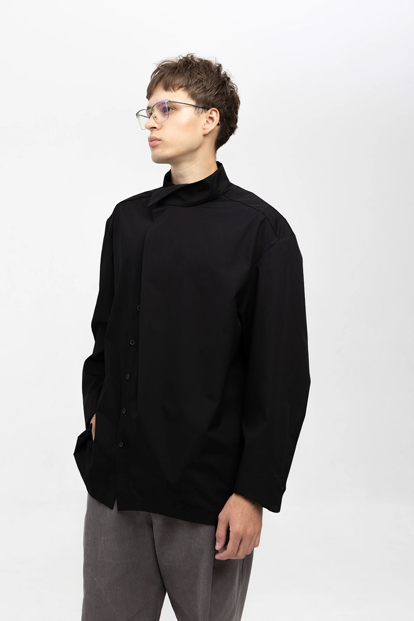 застёгиваться на шее. Стойка асимметричная, с заложенным краем.