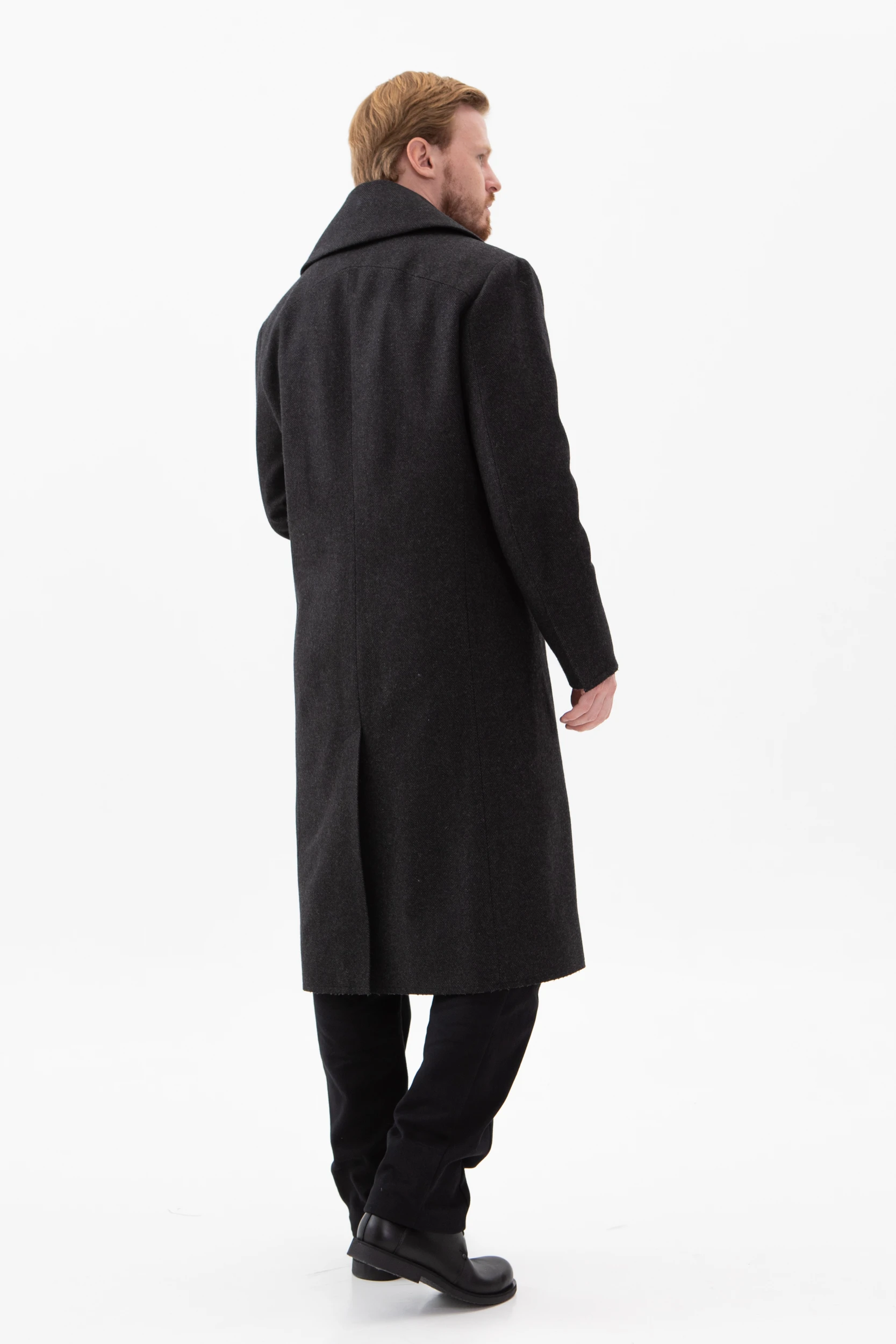 Пальто двубортное, внутренняя пола застёгивается на полодержатель, чтобы не провисала. Застёжка — супатная классическая на пуговицах. На левом лацкане выполнена петля в рамку, с помощью которой можно застегнуть пальто под самое горло.