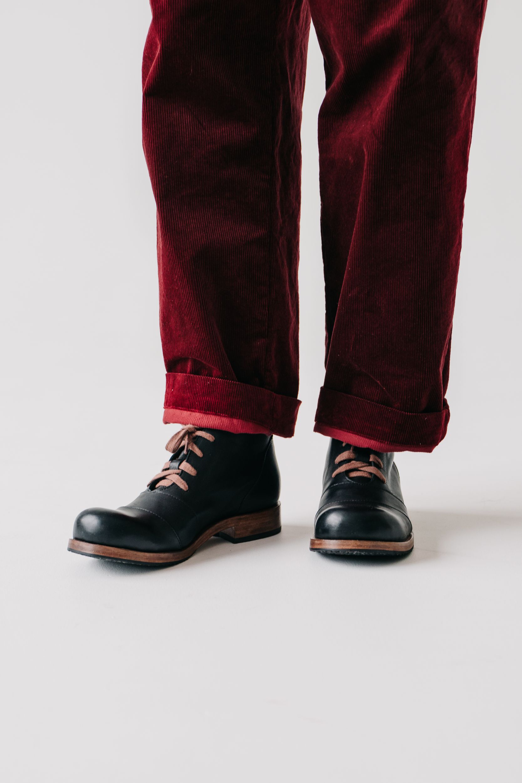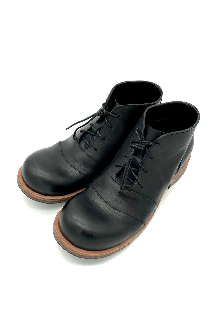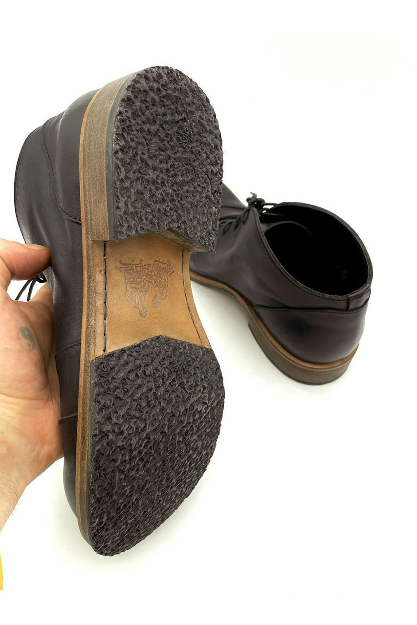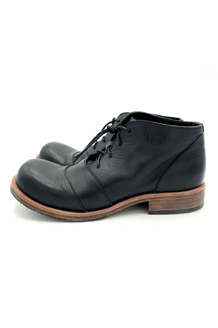 Ботинки выполнены из натуральной кожи черного цвета, которая со временем приобретает благородный винтажный вид. Особое внимание привлекает вздутый, объемный носок, придающий модели уникальный, слегка авангардный вид и дополнительный комфорт. Эта деталь не только выделяет ботинки из общей массы, но и обеспечивает больше пространства для пальцев, что делает их идеальными для длительной носки.