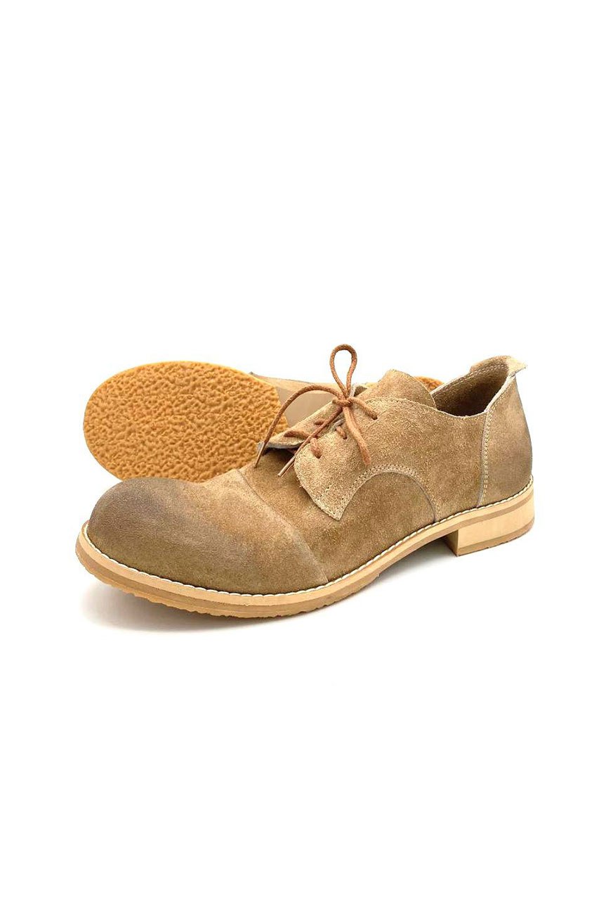 Верх модели изготовлен из натурального ворсистой кожи (спилок, кожаный велюр) в тёплом песочно-коричневом оттенке придаёт состаренный характер и уютную фактуру. Ручная обработка воском, натуральные материалы, французские и открытые швы придают модели выразительный силуэт с лёгкой динамикой, делают каждую пару уникальной.